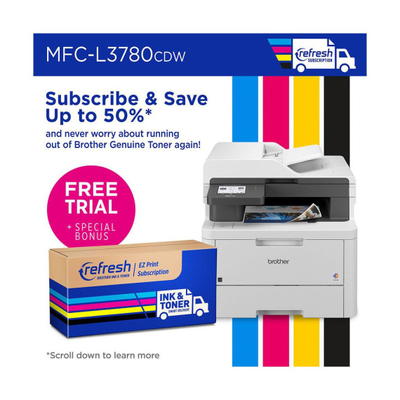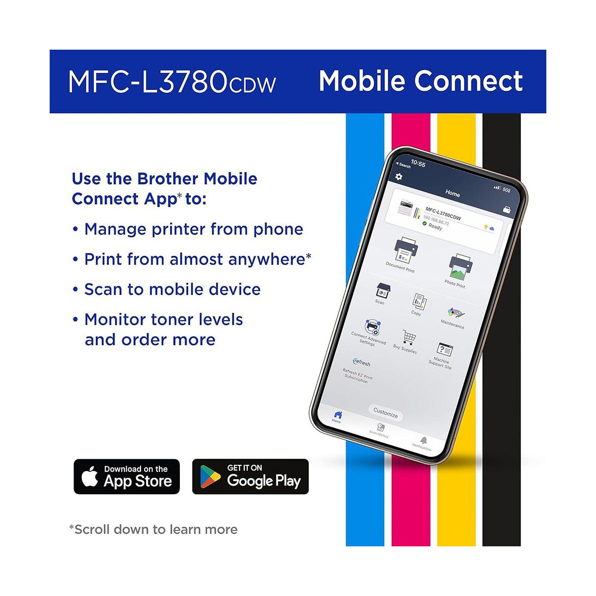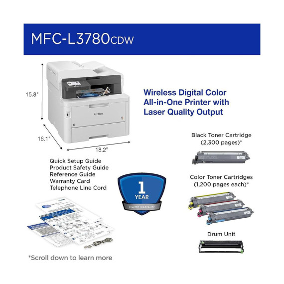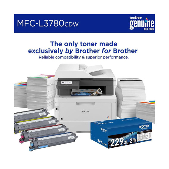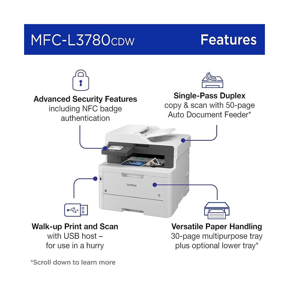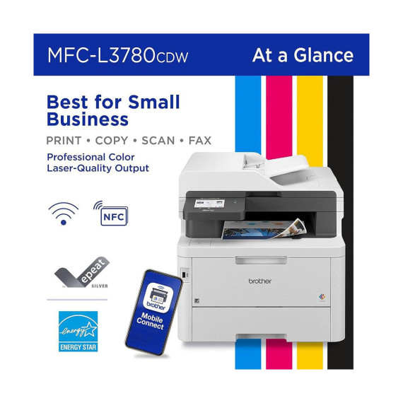 The Brother MFC-L3780CDW is a powerful wireless all-in-one color printer built for high-performance productivity. Designed for home offices and small businesses, it offers fast print speeds up to 31 pages per minute in both black and color. The MFC-L3780CDW delivers advanced features like single-pass duplex scanning and copying, automatic two-sided printing, and a 3.5-inch color touchscreen for seamless navigation and direct cloud access. It supports a wide range of connectivity options including dual-band Wi-Fi, Gigabit Ethernet, Wi-Fi Direct, USB, and NFC. With a 250-sheet paper tray, a 30-sheet multipurpose tray, and a 50-sheet auto document feeder, this printer can handle a variety of paper types and sizes. It’s also compatible with Brother’s Refresh EZ Print Subscription Service to help ensure you never run out of toner. Product Features: • Print, copy, scan, and fax functionality • Fast print speeds up to 31 ppm (black and color) • Single-pass duplex scanning and copying • 3.5” color touchscreen with cloud app access • Dual-band wireless, Ethernet, USB, Wi-Fi Direct, and NFC • 250-sheet input tray + 30-sheet multipurpose tray • 50-sheet automatic document feeder (ADF) • Compatible with Brother Refresh EZ Print Subscription Service Product Specifications: • Model: Brother MFC-L3780CDW • Print Technology: Digital Color LED • Functions: Print, Copy, Scan, Fax • Print Speed: Up to 31 pages per minute (black and color) • Print Resolution: Up to 2400 x 600 dpi • Display: 3.5" color touchscreen • Paper Capacity:  – 250-sheet main tray  – 30-sheet multipurpose tray  – Optional lower tray (total capacity up to 500 sheets) • ADF Capacity: 50 sheets • Duplex Printing: Yes (automatic two-sided) • Memory: 512 MB • Connectivity:  – Dual-band Wi-Fi (2.4GHz / 5GHz)  – Gigabit Ethernet  – Hi-Speed USB 2.0  – Wi-Fi Direct  – NFC • Mobile Print Support: Brother Mobile Connect, AirPrint, Mopria • Operating Noise: Approx. 48 dB(A) • Dimensions (Printer): 16.1" W x 15.8" D x 18.2" H • Weight (Printer): 47.8 lbs • Power Consumption: Approx. 960W max