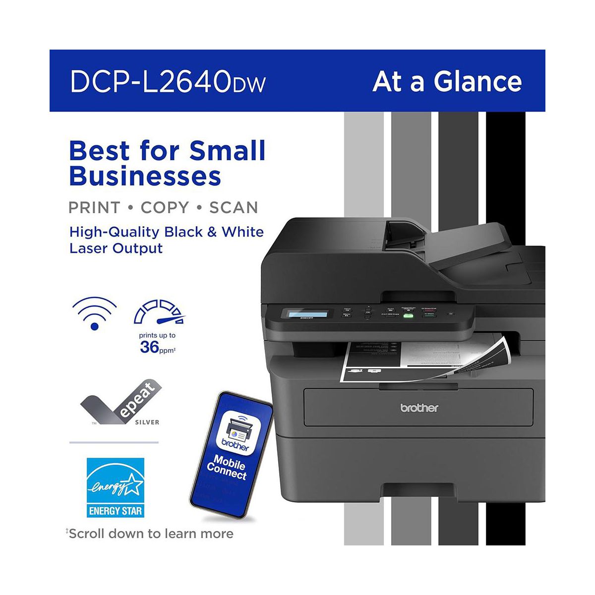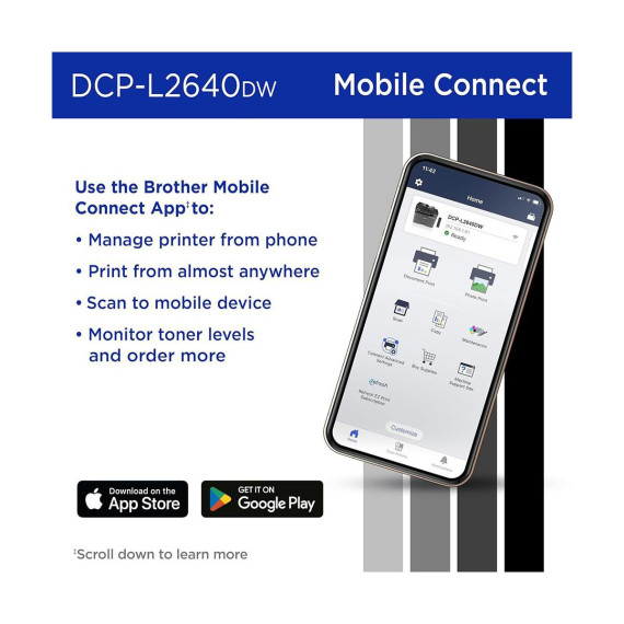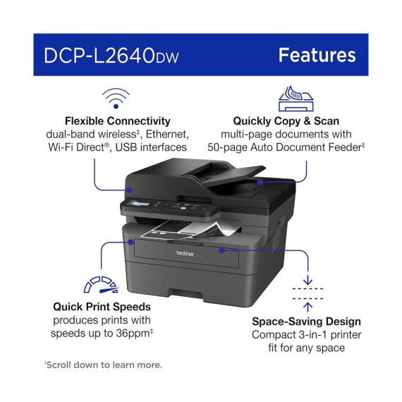Wireless connectivity lets you print directly from your laptop, smartphone, or tablet, while the intuitive control panel makes operation simple for any user. Engineered for durability and low-cost performance, the DCP-L2640DW is the dependable solution for everyday documents, schoolwork, and business productivity.