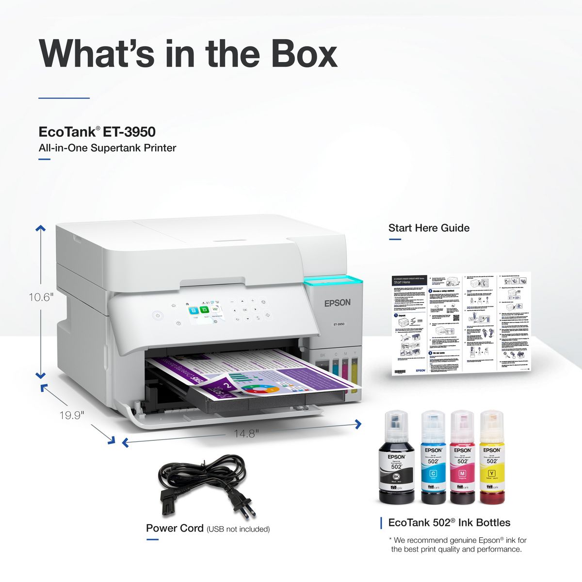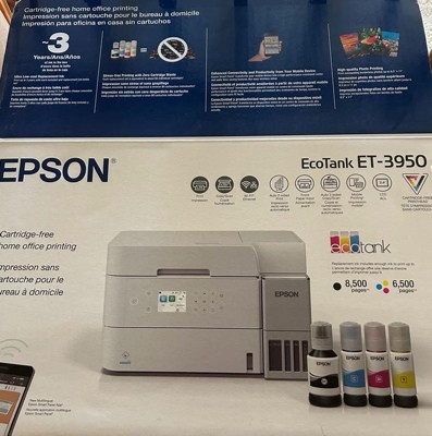 Introducing the EcoTank® ET-3950—The Perfect Printer for Busy Families. Say goodbye to expensive cartridges with the Epson EcoTank ET-3950, the newest innovation from a recognized leader in photographic printing. Combining simplicity with a modern design, the ET-3950 features advanced technology that enhances both performance and print quality, making it an ideal choice for home office printing—including content created by AI. Powered by PrecisionCore® Heat-Free technology, the ET-3950 offers a duty cycle that’s twice as robust as its predecessor3. And unlike conventional thermal inkjet printers, its unique permanent printhead is engineered to last the life of the printer. Designed to be simple and error-free, refilling ink is a breeze with large ink tanks and uniquely keyed EcoFit® bottles—no mess, no stress and no ink bottle mix-ups. And with enough ink in the box to last up to three years4, you'll enjoy affordable, worry-free color printing without the hassle of frequently replacing cartridges. Featuring built-in USB and Wi-Fi® for seamless connectivity, along with the user-friendly Epson Smart Panel® app5, you can easily print, scan, and more directly from your computer or wireless mobile device6. Choose Epson EcoTank, the World’s #1 Selling Supertank Printer2. With more than 100 million units sold globally7 across seven generations of innovation, EcoTank consistently delivers affordable, photo-quality prints, making it a reliable choice for all your printing needs.