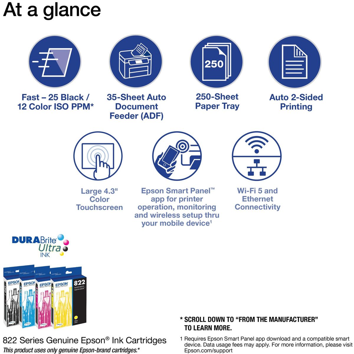 Experience the power of high-performance business printing with the WorkForce Pro WF-4820. Providing high-speed printing, the WF-4820 blazes through high-volume print jobs at an astounding 25 black/12 color ISO ppm†. Built for productivity, this reliable printer consistently delivers sharp, professional-quality prints with innovative PrecisionCore Heat-Free Technology™ and vivid DURABrite® Ultra instant-dry pigment inks. An efficient, easy-to-use solution, the WF-4820 offers convenient features designed to enhance efficiency and streamline workflow, including a large, 4.3" color touchscreen for intuitive navigation, a 250-sheet paper capacity, auto 2-sided printing, wireless connectivity and more.