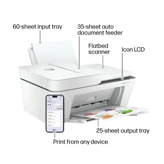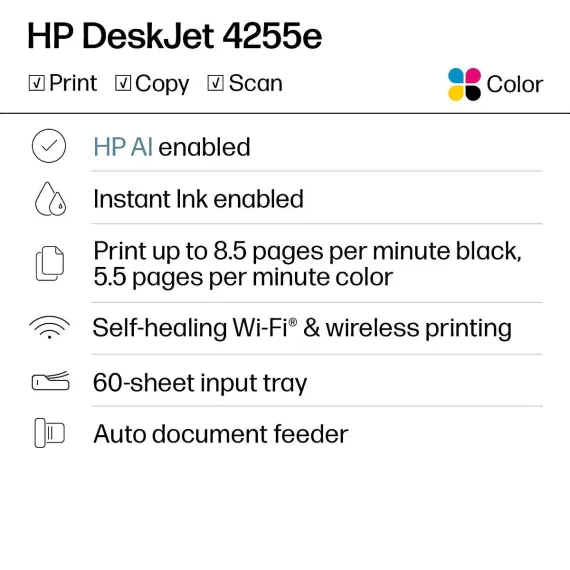 The HP DeskJet 4255e delivers color printing, 60-sheet paper capacity, and an auto document feeder for easy scanning and copying. It also includes 3 months of free Instant Ink with HP+ activation at printer setup.