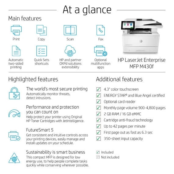 Overview - HP Office Laser Multifunction Printers are designed for SMBs and small workteams in larger companies, delivering enhanced productivity, simplified workflows and reduced costs. - This printer is intended to work only with cartridges that have a new or reused HP chip, and it uses dynamic security measures to block cartridges using a non-HP chip. Periodic firmware updates will maintain the effectiveness of these measures and block cartridges that previously worked. A reused HP chip enables the use of reused, remanufactured, and refilled cartridges. Features Easy to use, simple to manage - HP FutureSmart firmware can be updated with the latest featuresto optimize your investment for years to come. The world’s most secure printing - The operating code (BIOS) is automatically checked duringstartupand repairs itself if compromised. Enhanced productivity to empower work teams - Give workgroups what they need to succeed with hundreds of HP and third-party solutions and card reader support. Sustainability is smart business - Help save paper right out of the box. Two-sided (duplex) printing is set at default for automatic savings. Minimum system requirements - 2 GB available hard disk space Internet connection or USB port Internet browser. What's in the box? - HP LaserJet Enterprise MFP M430f printer; HP Black Original LaserJet Toner Cartridge (~3,000 pages); Getting started Guide; 1 Power cord Disclaimers - HP’s most advanced embedded security features are available on HP Managed and Enterprise devices with HP FutureSmart firmware 4.5 or above. Claim based on HP review of 2019 published features of competitive in-class printers. Only HP offers a combination of security features to automatically detect, stop, and recover from attacks with a self-healing reboot, in alignment with NIST SP 800-193 guidelines for device cyber resiliency. - Some features enabled by future HP FutureSmart firmware upgrades may not be available on older devices, if forexample, physical product characteristics limit the functionality of the new feature. - Third-party certification based on Common Criteria Information Technology Security Evaluation ISO/IEC 15408 Standard requirements as of May 2019. Certification applicable to HP Managed and Enterprise devices running HP FutureSmart Firmware version 4.5.1 and later. - Use of the HP Trusted Platform Module may require a firmware upgrade. - Wireless performance is dependent on physical environment and distance from access point and may be limited during active VPN connections. - Dependent upon country setup specifications. - HP Secure Print is optional and requires a license.