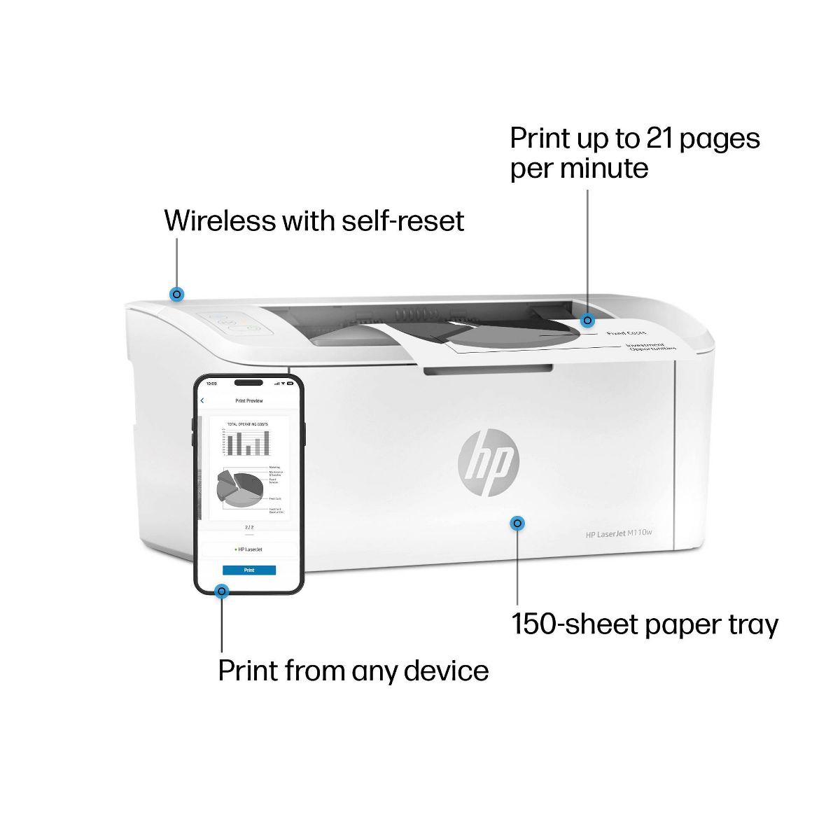 The world's smallest laser printer in its class, the HP LaserJet M110w is perfect for printing black & white forms and documents. It offers high-speed printing, seamless setup and reliable connectivity.