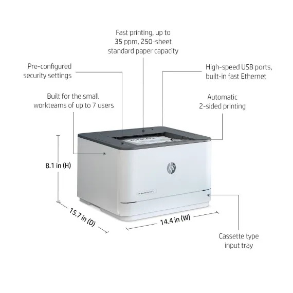 Overview - This LaserJet Pro printer is built with powerful productivity features for small teams — fast speeds, built-in security, and cloud connectivity so you can setup and manage it from anywhere. - Workteams excel with HP’s black-and-white office LaserJet printers, which pack extra punch with high-quality results, extra power, and more features. - - Save on quality, refurbished products. The HP collection of Certified Refurbished products are thoroughly tested to meet the same functional standards as comparable new products. HP’s refurbished products are put through a series of mechanical and electrical stress tests, complete software re-installation, a final inspection, and then thoroughly cleaned, sanitized and packaged in new boxes with the same supplies as new version printers. Refurbished Print products are covered by a same as new HP limited warranty and offer optional HP Care Pack Services. Most often, refurbished products are indistinguishable from their comparable new counterparts, though some may have cosmetic blemishes or scratches. This printer is intended to work only with cartridges that have a new or reused HP chip, and it uses dynamic security measures to block cartridges using a non-HP chip. Periodic firmware updates will maintain the effectiveness of these measures and block cartridges that previously worked. A reused HP chip enables the use of reused, remanufactured, and refilled cartridges. Features Powerful productivity. - Support your small workteams with this laser printer, designed for up to 7 users. Seamless management. - Centralize print management for your enterprise. HP Web JetAdmin makes it easy with its suite of features. HP Wolf Pro Security. - Get printer security out of the box. Preconfigured settings mean it's ready when you are. Minimum system requirements - Microsoft® Windows® 11, 10, 2 GB available hard disk space, Internet connection, Microsoft® Internet Explorer or Edge. Disclaimers - Measured using ISO/IEC 24734 and excludes first set of test documents. For more information, see hp.com/go/printerclaims. Exact speed varies depending on the system configuration, software application, driver, and document complexity. - R Requires HP app download available at www.hp.com/go/mobileprinting. Certain features are available in English language only, and may vary by printer model/country, and between desktop/mobile applications. HP reserves the right to introduce charges for use of functionality facilitated by the HP app. Internet access required and may not be available in all countries. HP account required for full functionality. Fax capabilities are for sending a fax only. List of supported operating systems available in app stores. See details at www.hp.com/hp-app. - HP Web Jetadmin is available for download at no additional charge at hp.com/go/webjetadmin. - HP calculations based on ENERGY STAR® normalized TEC data comparing HP LaserJet 200-500 series printers at launch. - HP Auto-On/Auto-Off Technology capabilities subject to printer and settings; may require a firmware upgrade. - Recycling: Program availability varies. Original HP cartridge return and recycling is currently available in more than 60 countries, territories and regions in Asia, Africa, Europe, and North and South America through the HP Planet Partners program. For details, see hp.com/recycle. - Internet access required and must be purchased separately. Wireless operations are compatible with 2.4 GHz and 5.0 GHz operations only. Supports both 5.0 GHz and 2.4 GHz using up to 12 non-overlapping channels vs. only 3 non-overlapping channels for 2.4 GHz only. Supports 5.0 GHz band (up to 150 mbps) v. 2.4 GHz band (up to 72.2 mbps). Learn more at: www.hp.com/go/mobileprinting - HP JetAdvantage Security Manager must be purchased separately. To learn more, please visit hp.com/go/securitymanager.