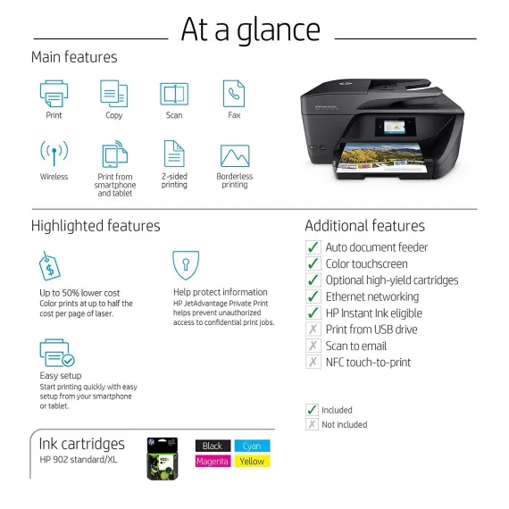 Make sure this fits by entering your model number. Print up to 2.5x more pages and replace cartridges less often, using original HP high-yield ink cartridges. Main functions of this HP color inkjet photo printer: copy, scan, fax, wireless printing, two-sided duplex printing and scanning, color touchscreen, automatic document feeder, Instant Ink ready so you'll never run out of ink, and more Set your business apart with original HP ink that delivers results you can rely on. Easily print when and where you need to from your smartphone, tablet, or notebook PC. Get convenient mobile printing options and mobile setup. Connect the way you want to with Ethernet and wireless networking HP OfficeJet Pro 6978 is ideal for the home office or small workgroups that need professional-quality, affordable color with powerful productivity and fast functionality Original HP Cartridge Yield (approx.): ~825 pages Black, ~825 pages Cyan, ~825 pages Magenta, ~825 pages Yellow