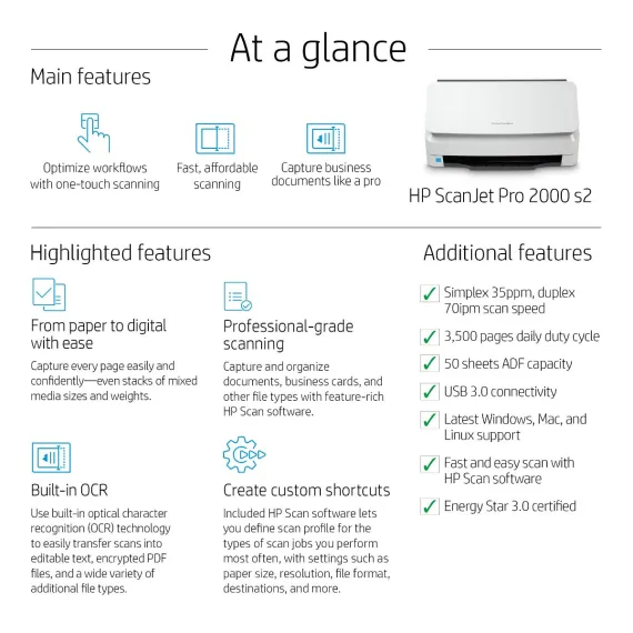 Fast, affordable, and designed to handle everything from simple color jobs to complex workflows. Quickly and reliably digitize larger projects with scan speeds up to 35 ppm/70 ipm and a 50-page ADF.[1] Recommended for 3,500 pages per day.