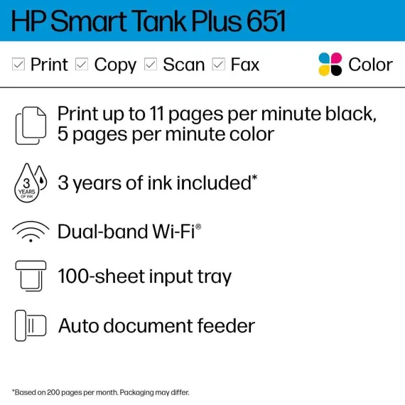 The HP Smart Tank Plus 651 Printer is a refillable tank printer that makes printing seamless for your home with its high capacity and wireless connectivity. Create everyday color documents at a low cost with 3 years of Original HP Ink included in the box. This Smart Tank printer is a cartridge-fre inkjet perfect for high-volume printing.