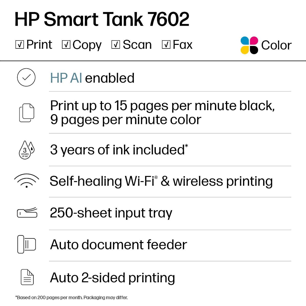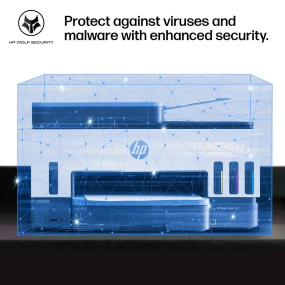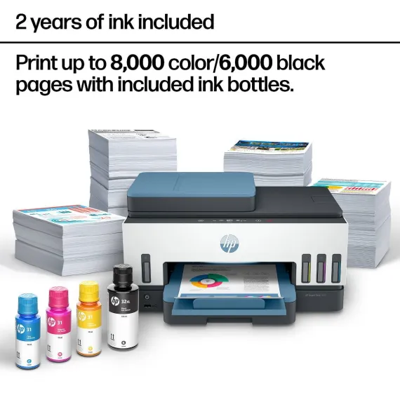 The HP Smart Tank 7602 Printer is a smart, connected and refillable tank printer that makes printing seamless for your home office and small business with its high capacity, wireless connectivity and Ethernet networking. Create everyday color documents at a low cost with 3 years of Original HP Ink included in the box. This cartridge-free Smart Tank printer is an inkjet perfect for high-volume printing. It's also AI-enabled to intuitively adapt to your workflow, with wireless and security features that keep your multifunction printer up to date and secure.