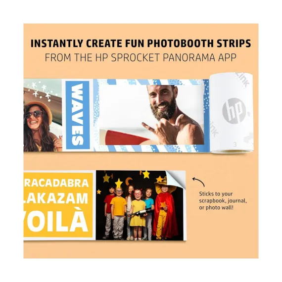 This HP portable printer lets you instantly print your favorite photo projects, labels, photobooth strips, and more, from 0.5” to 9” long on 2” wide sticky-backed paper! Take the mini photo printer anywhere for fun, on-the-go creativity. With the compatible HP Sprocket Photo Printer Panorama app, you can easily customize your creations with filters, and more before printing from your iOS or Android.