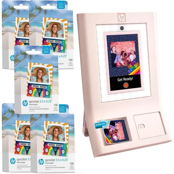 HP Sprocket Photobooth 3x4" Photo Printer (Pink) Bundle w/3.5 x 4.25” Zink Photo Paper (500 Sheets)