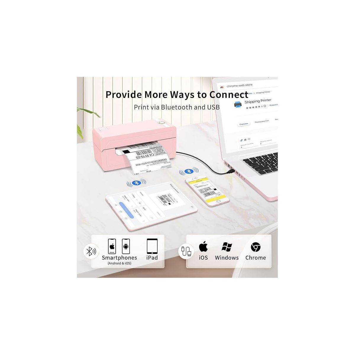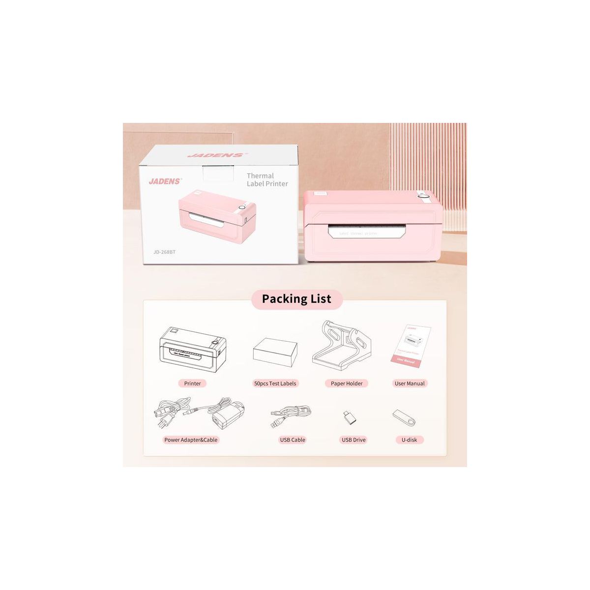 JADENS 268BT High-Speed Thermal Label Printer – Bluetooth & USB, Ink-Free & BPA-Free, 4x6 Shipping Labels (Pink)