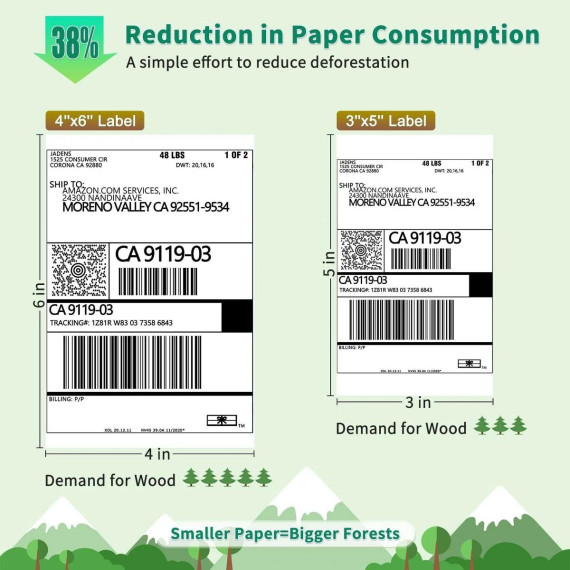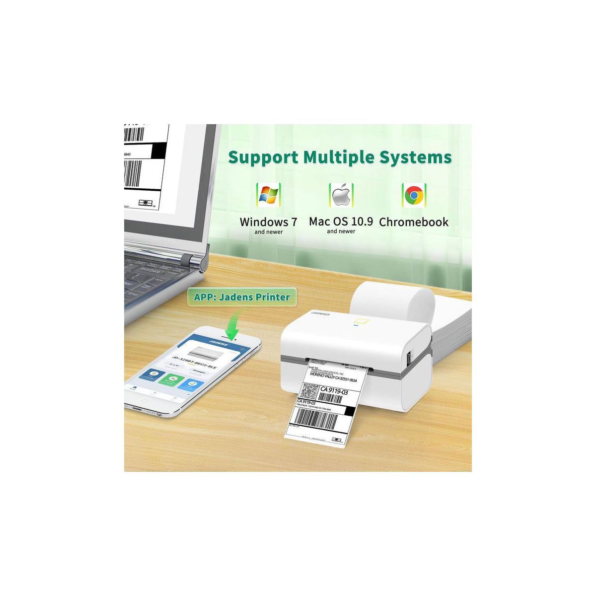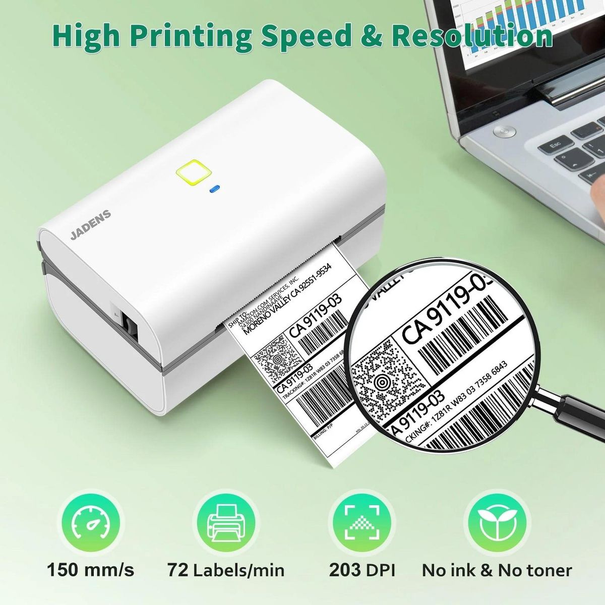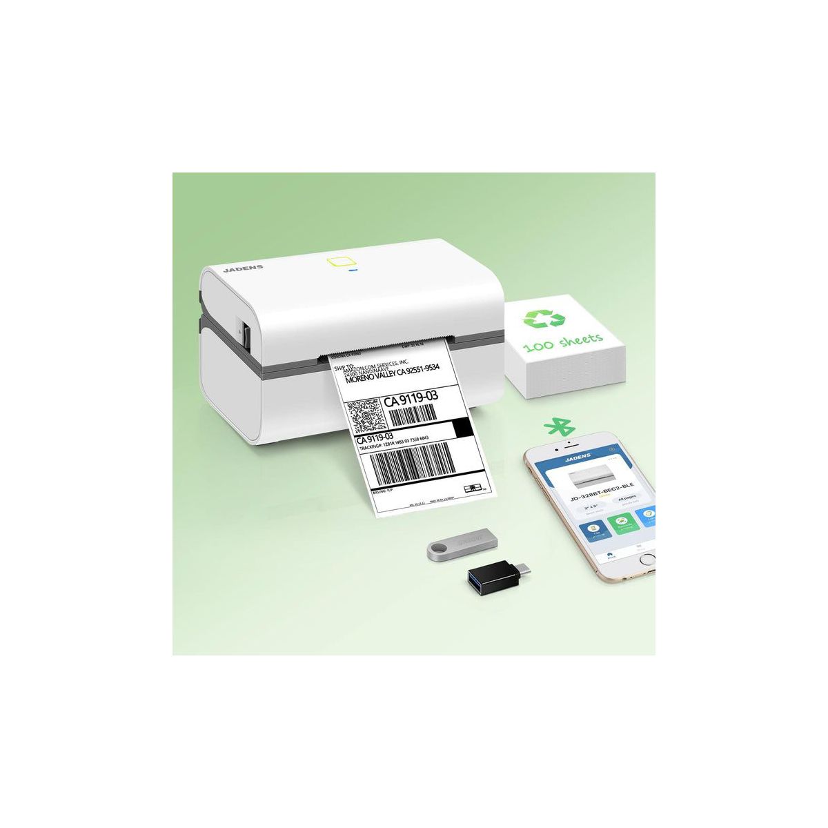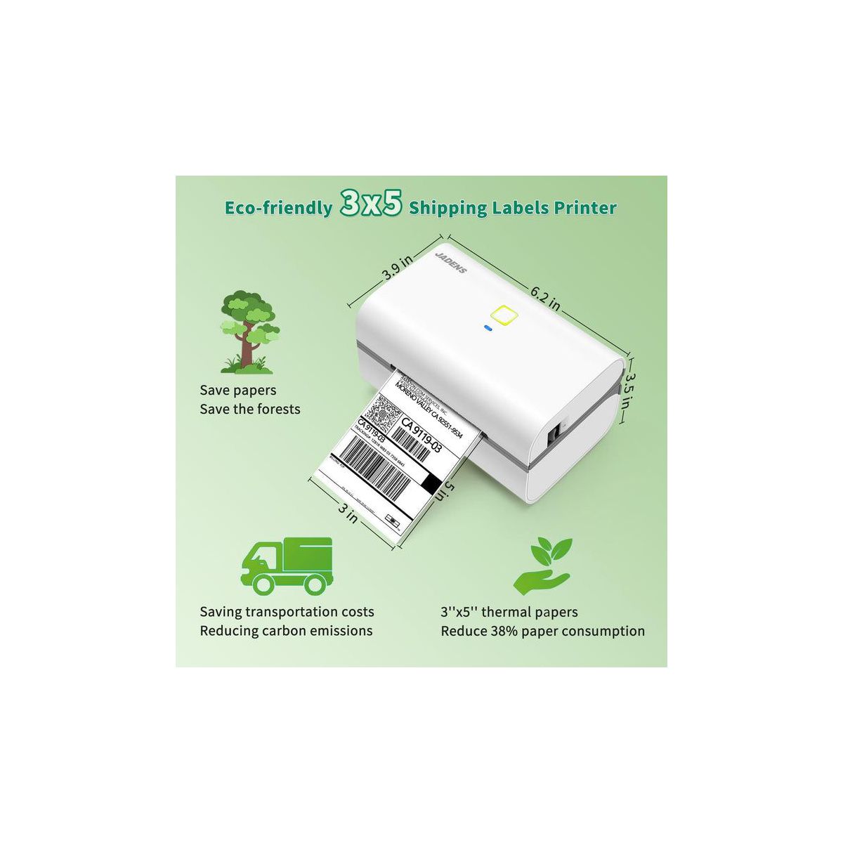 The JADENS 328BT Thermal Label Printer is a compact, high-speed solution for small businesses and home offices looking to save space, time, and cost. Designed for 3x5-inch labels, it reduces paper consumption by up to 38% compared to standard 4x6 printers—making it an eco-conscious choice for everyday shipping. With wireless Bluetooth connectivity via the JADENS Printer app (iOS/Android) and USB support for Mac, Windows, and Chromebook, setup is simple and flexible across devices. It prints up to 70 3x5" labels per minute with crisp 203 DPI resolution—no ink or toner required. Compatible with all major shipping and e-commerce platforms, the 328BT supports a wide range of direct thermal labels from 1.57" to 3.15" wide. It automatically calibrates paper for accurate, smudge-free results and keeps your workflow running smoothly.