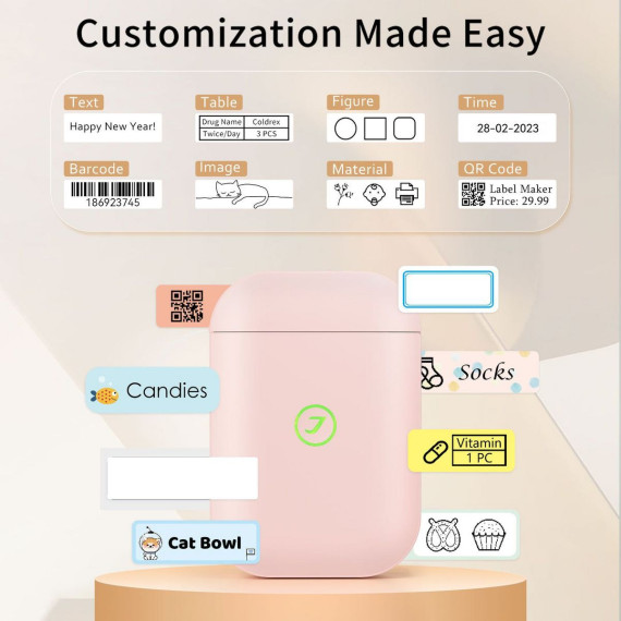 The JADENS D11 Bluetooth Thermal Label Maker is a compact, rechargeable device designed for effortless labeling at home, in the office, or on the go. With wireless Bluetooth connectivity and a free companion app for iOS and Android, you can create custom stickers and labels in minutes using over 400 templates, 60+ frames, 1000+ symbols, and a wide variety of fonts and languages. Powered by BPA-free thermal technology, the D11 prints crisp, waterproof, and oil-proof labels without ink or toner—saving you time and money. Its high-speed chip and 203 DPI resolution ensure sharp, fade-resistant output. The built-in battery lasts up to 5 hours of continuous use and holds a charge for weeks. Whether you're organizing storage, labeling school supplies, tagging cosmetics, or crafting personalized gifts, the D11 makes it easy to bring your ideas to life. One roll of thermal label paper is included to get you started right away.