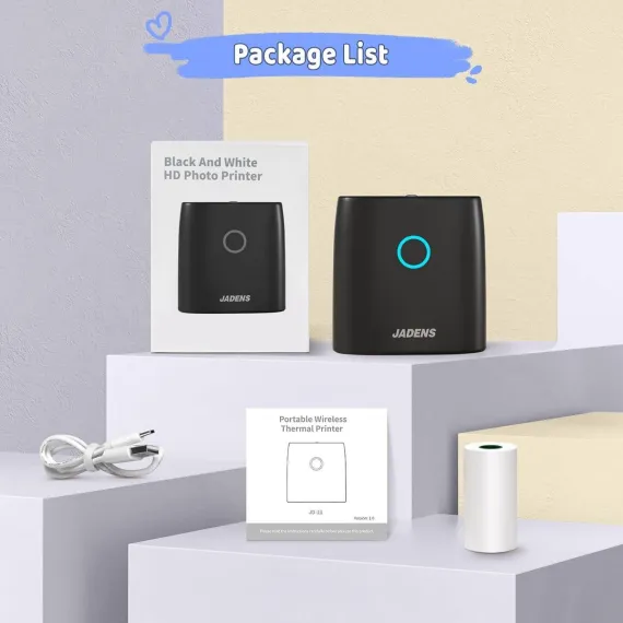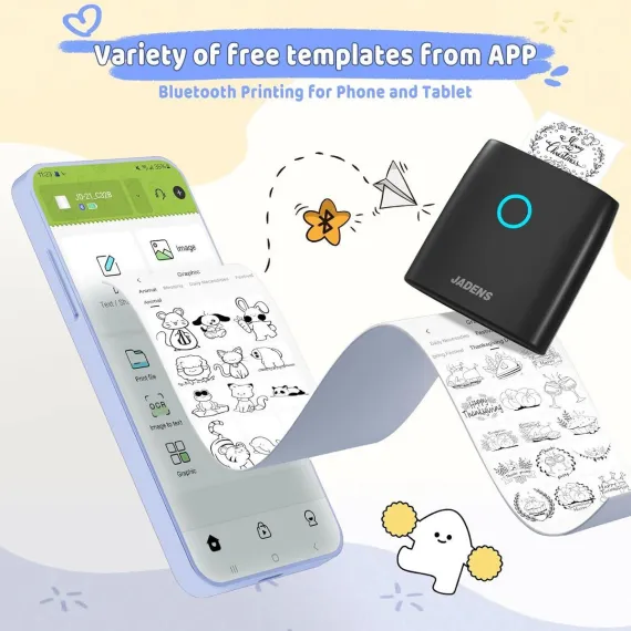 The JADENS JD21 Mini Sticker Printer is the printer you never knew you needed. Compact, portable, and packed with creative potential, this Bluetooth thermal printer lets you design and print 2-inch stickers, labels, and more—anytime, anywhere. The free "JadensPrinter" app is loaded with fonts, graphics, templates, and tools to bring your ideas to life. Whether you're crafting, journaling, organizing, or gifting, the JADENS JD21 Mini Sticker Printer delivers vivid, high-resolution prints on both self-adhesive and non-stick thermal paper rolls. With up to 15 hours of battery life and a full week of standby time, it’s ready when inspiration strikes. And thanks to thermal technology, it prints without ink or toner—saving you time, money, and mess. BPA-free sticker paper included. Perfect for printing photos, memos, shopping lists, and spontaneous creativity on the go.