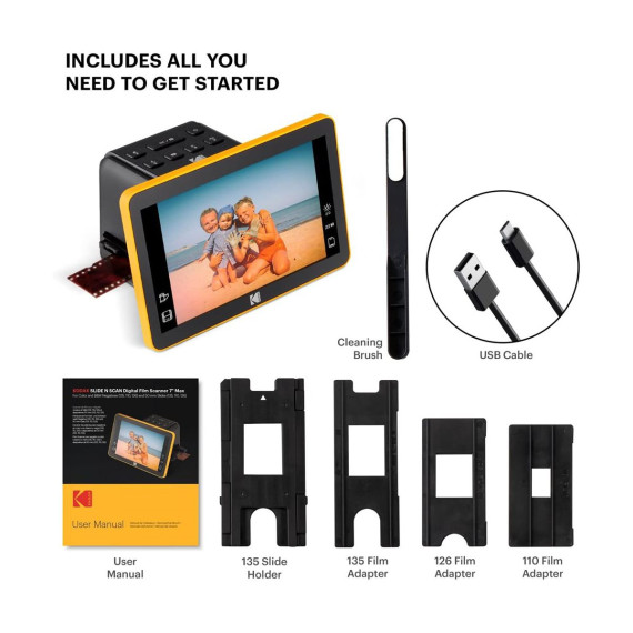 Love reminiscing with film negatives and slides from yesteryear? With the new SLIDE N SCAN Max Digital Film Scanner from KODAK, you can view, edit and convert your old photos, no tech savvy necessary! This easy yet elegant 22MP negative scanner delivers crisp, clear, beautiful images with the press of a button. Best of all, there’s no straining to see. Watch old memories come to life on the large 7” LCD screen of the digital scanner with extra wide viewing angle and gallery mode—perfect for previewing pictures, or for using the slide viewer as a desktop photo frame!