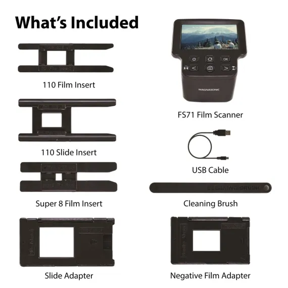 What's Included: FS71 Film Scanner, Slide Adapter, Negative Film Adapter, 110 Slide Insert, 110 Film Insert, Super 8 Insert, Mini USB-to-USB Cable (40.5"), Cleaning Brush, Instruction Manual, 1 Year Manufacturer's Direct Warranty
