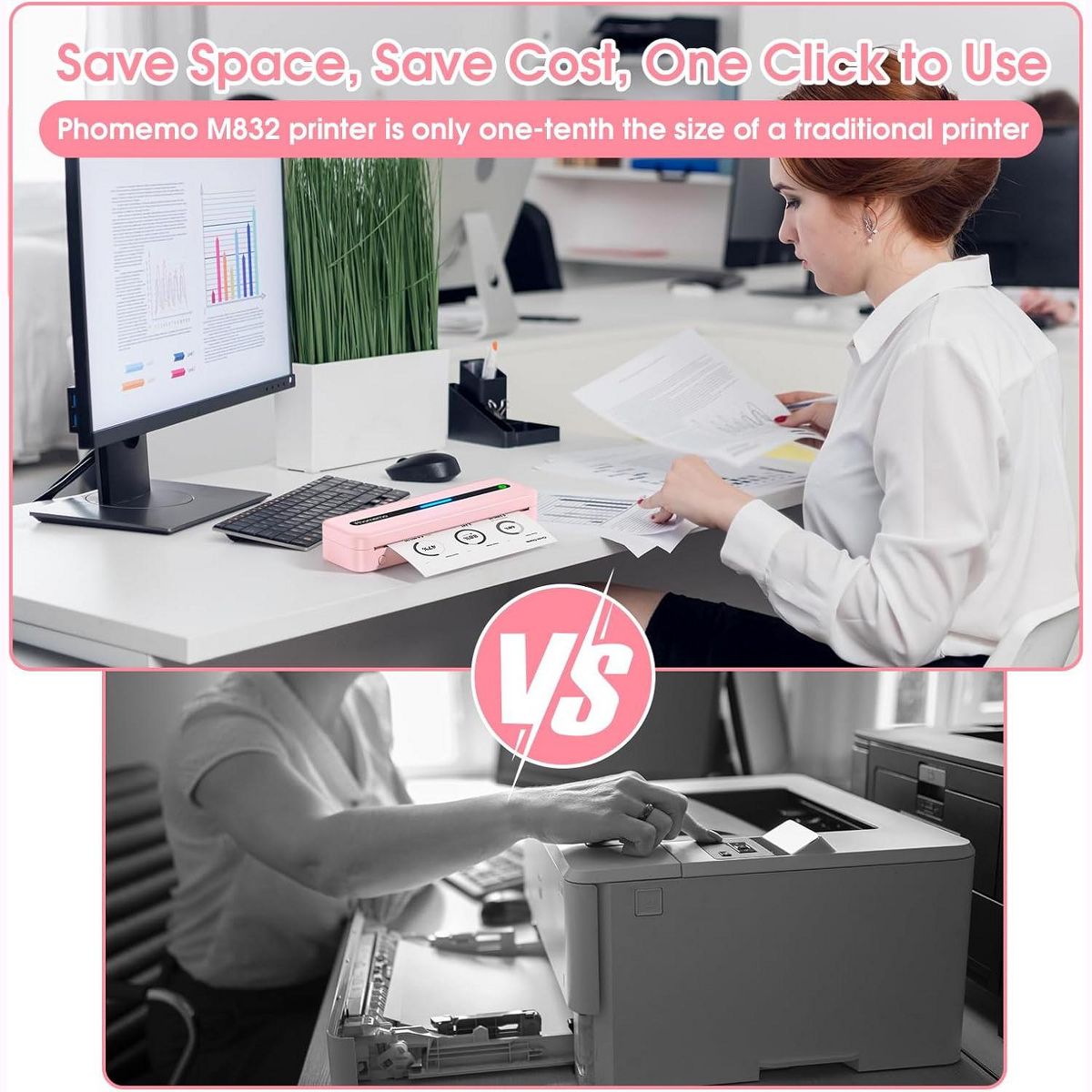 The Phomemo M832 is the ultimate high-definition printer for work-from-home and on-the-go printing. Equipped with a 300dpi print head and a built-in paper bin, this compact, inkless thermal printer delivers crisp, professional-quality documents anytime, anywhere. Its seamless Bluetooth connectivity and versatile paper support make it the perfect solution for effortless printing, whether you're at home, in the office, or traveling.