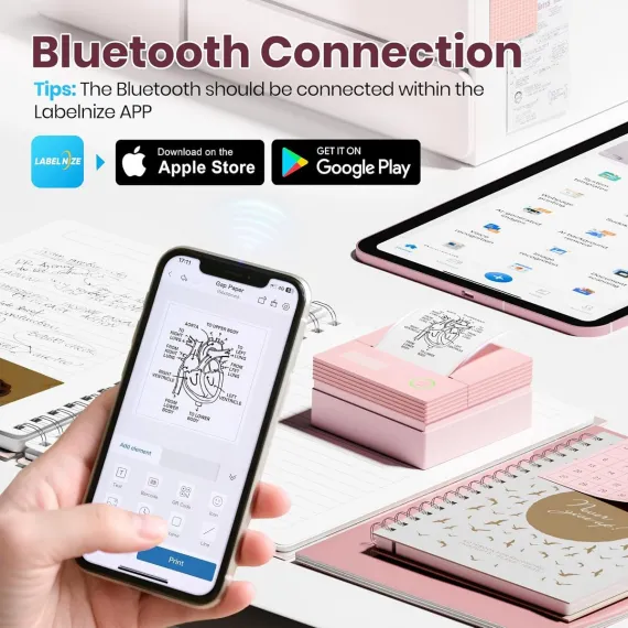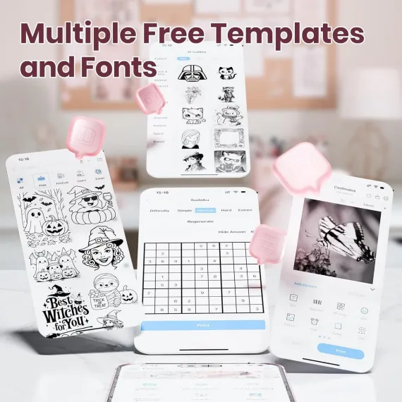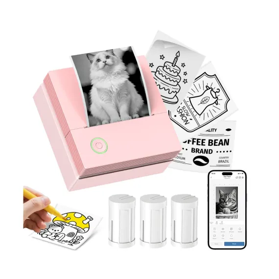 PM290C Inkless Sticker Printer: A portable Bluetooth mini printer for notes, journals & DIY. Comes with 3 paper rolls. The ideal creative gift.Pink