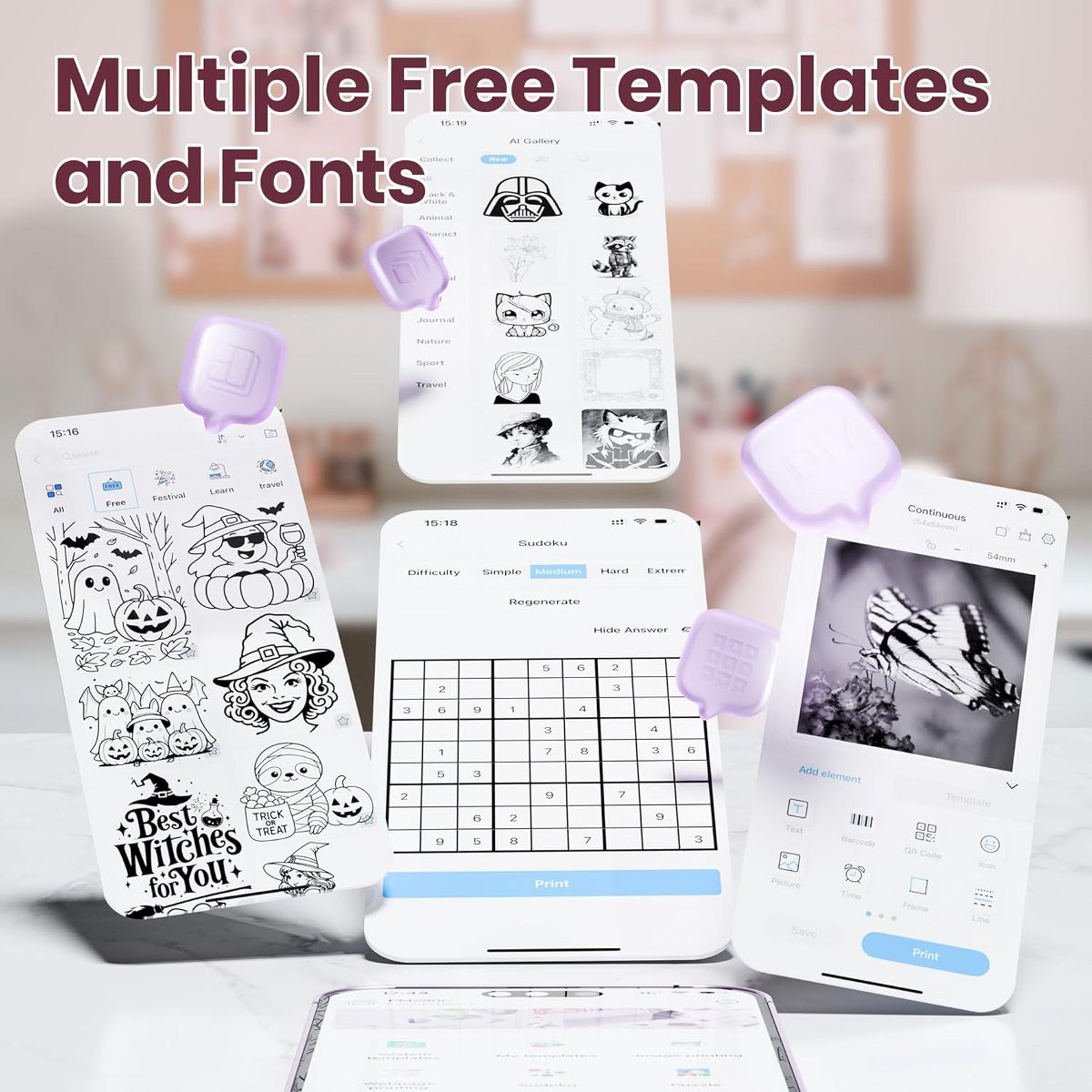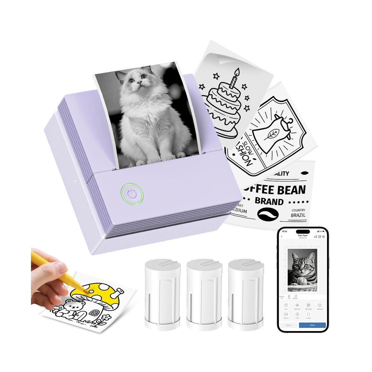 PM290C Inkless Sticker Printer: A portable Bluetooth mini printer for notes, journals & DIY. Comes with 3 paper rolls. The ideal creative gift.Purple