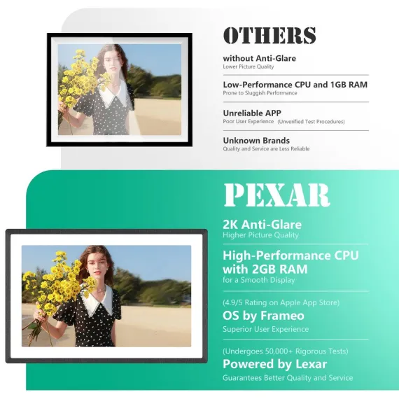 Bring friends and family from around the globe closer with the pexar frame. Share photos and videos via the internet in superior 2K display quality while your information remains private and secure. With easy setup, it is user-friendly for everyone, making it the ideal gift for displaying photos and videos. Powered by Lexar, a brand you know you can rely on.