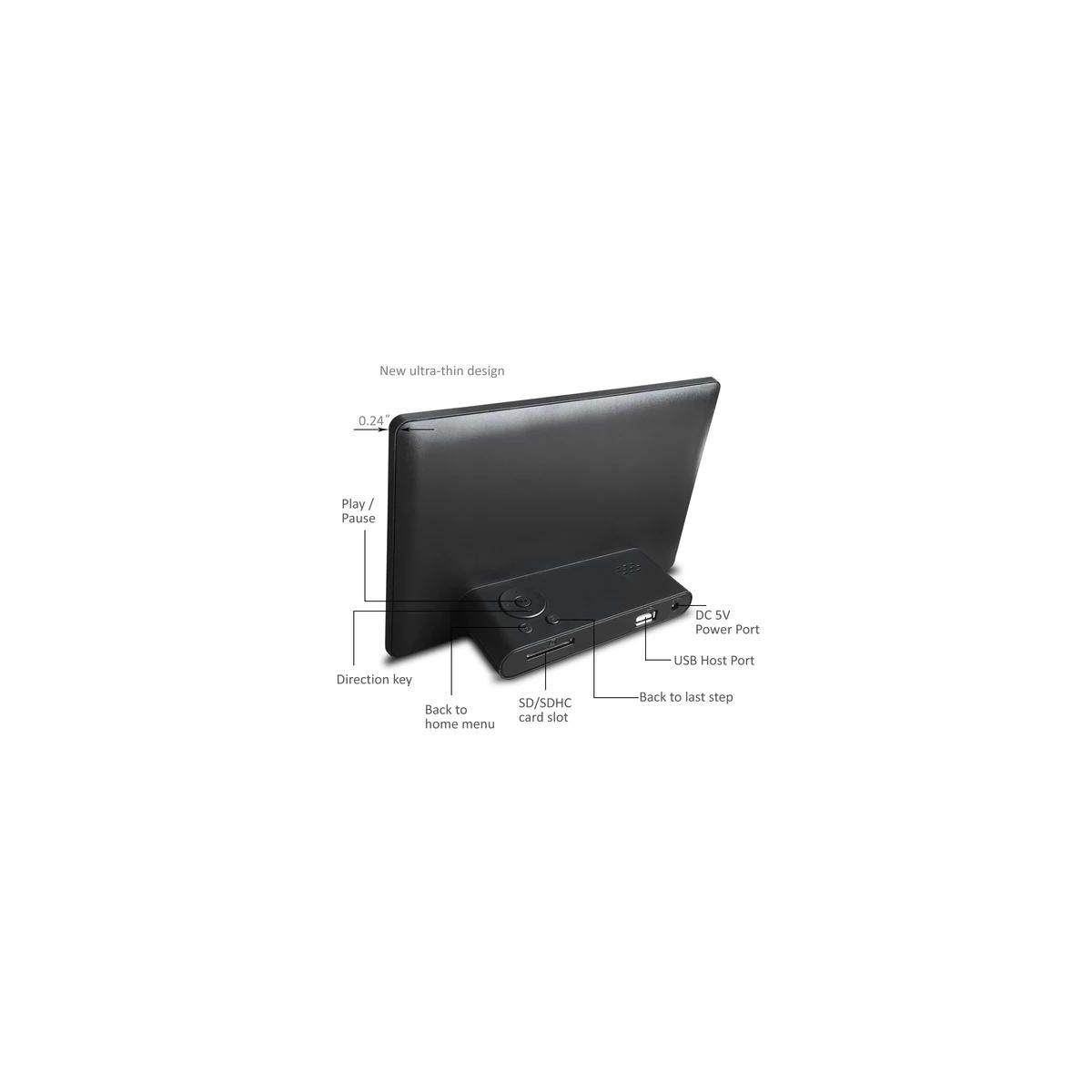 This digital photo frame is a great gift for any occasion. With its 7-inch widescreen 1024x600 pixel resolution (16:9 Aspect Ratio) Digital LCD Display and multiple photo slide show transitions and interval time, viewing your favorite photos is fun and easy. A wide range of external memory options are supported including SD/SDHC memory cards and USB 2.0 flash drives making viewing pictures simple and effortless. User-friendly shortcut keys on the back allow you to access your content instantly and navigate through the menu options quickly. This brand new design and ultra chic black frame matches any décor, and with a built in stand it is easy to setup on any table or desk.