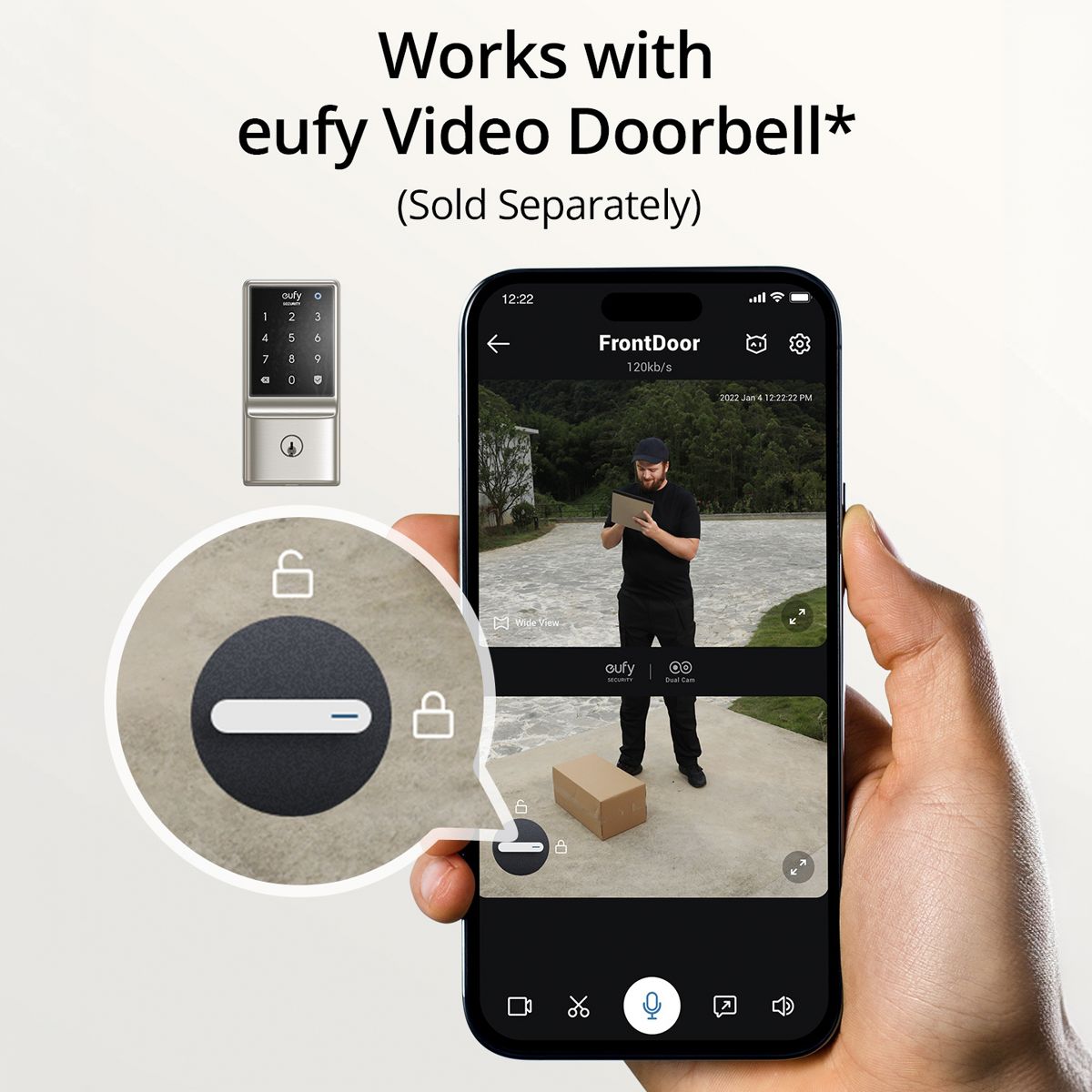Enhance your home security from wherever you are with eufy 5-in-1 Smart Lock C210. No separate bridge required, this smart lock is Wi-Fi enabled and compatible with eufy Security App for remote control anytime, anywhere. Receive notifications, set and disable time-based passcodes, and view door activity history for added peace of mind. In The Smart Lock C210 offers 5 unlocking methods: hands-free via the eufy App, voice control with Alexa or Google Voice Assistant, a smudge-free touchscreen keypad, Apple Watch, or the included physical keys. Its sleek design suits all door styles and features an automatic lock to prevent unauthorized access. Withstanding outdoor temperatures of -22℉ to 158℉, it offers around 4 months of battery life and can be instantly unlocked with a portable charger if power runs out. Tested by BHMA, the Smart Lock C210 can be expected to lock and unlock up to 10 times a day for over 30 years.