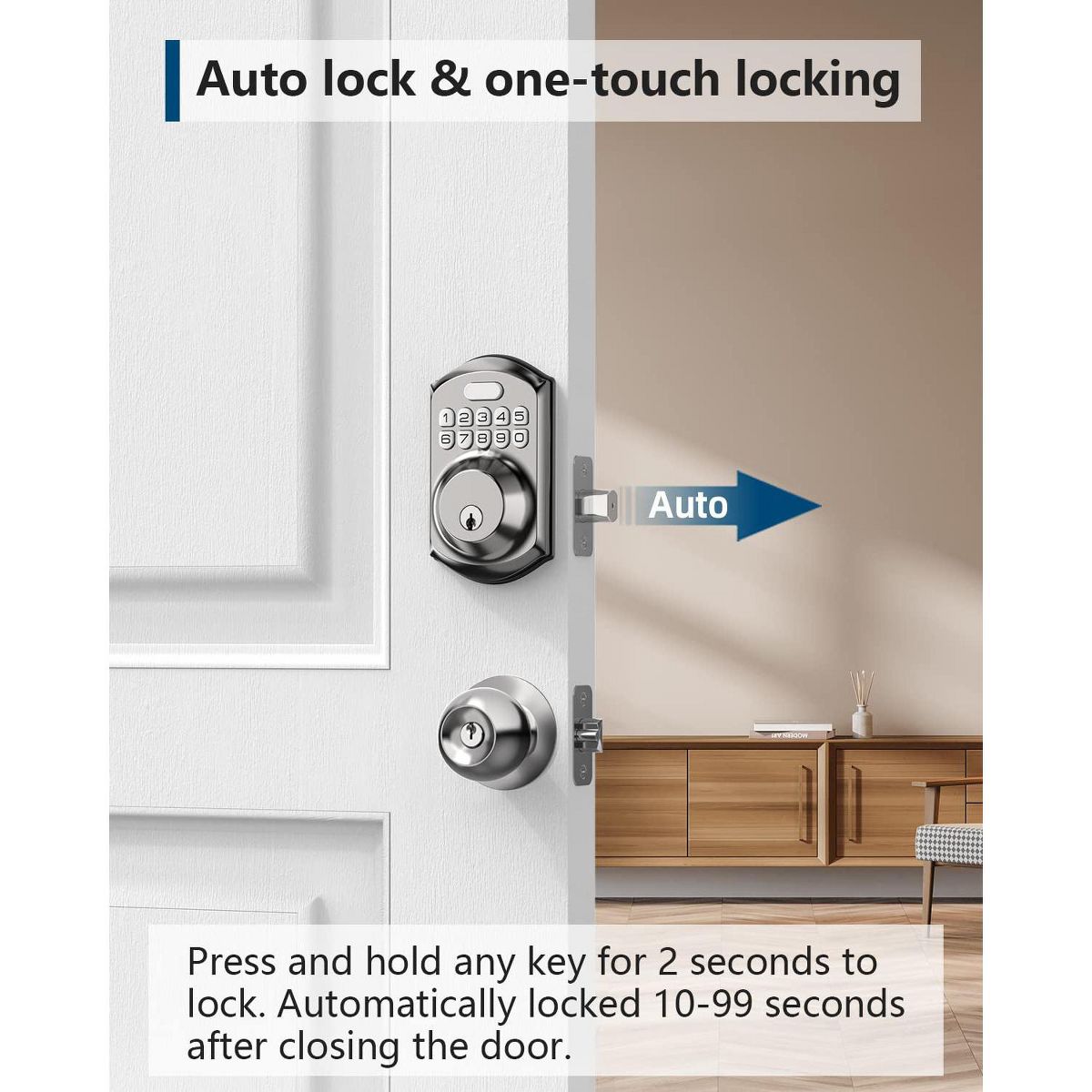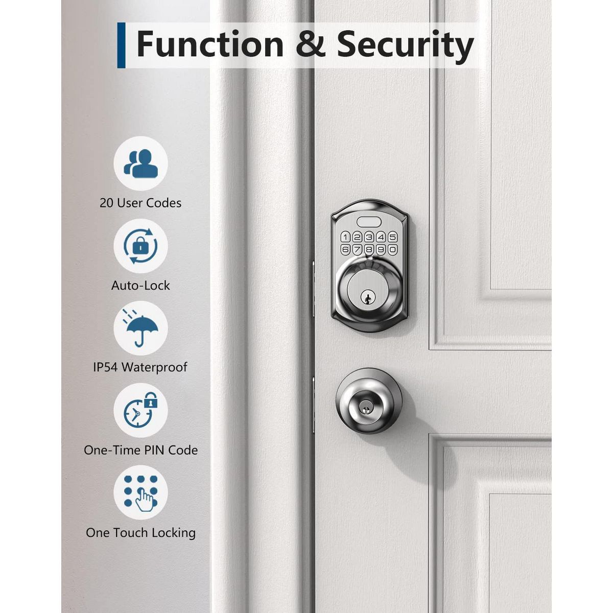Upgrade your home security with this keyless entry door lock. It offers 20 access codes for family and a single - use guest code. With a solid aluminum alloy deadbolt, it's weather - resistant (IP54) and built to last. The smart locking system can be set to lock in 10 - 99 seconds or use one - touch auto - lock. It also has anti - peeping code protection. For added convenience, it comes with 2 keys. Installation is a breeze, taking just minutes with a screwdriver. Ideal for front doors, it provides hassle - free access and reliable protection, making your daily life more convenient.