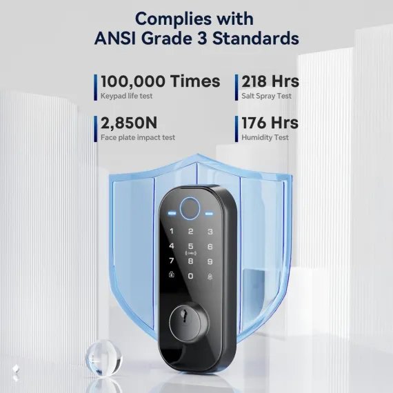 Upgrade your home security with this smart keyless entry door lock. It offers 5-in-1 unlocking options, including Wi-Fi remote control, fingerprint, passcode, fob, and backup key. With a built-in doorbell, you'll never miss a delivery. It can store up to 200 fingerprints or passcodes, making it perfect for families, roommates, or offices. The 0.2-second fingerprint scan works for all finger conditions. The built-in Wi-Fi allows for app control without an extra gateway. You can unlock the door remotely, send one-time codes for added security, and sync access logs. There are 4 smart passcode modes for flexible access. The smart auto-lock feature can be customized from 5 to 60 seconds, and one-touch lock buttons are available on both sides. The lock is made of scratch-resistant zinc alloy with an IP54 rating, suitable for various U.S. climates. It fits U.S. standard doors and can be installed in just 15 minutes with a Phillips screwdriver, no drilling required. This lock brings convenience and security to your daily life, whether you're a busy professional or a remote worker.