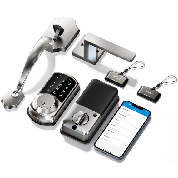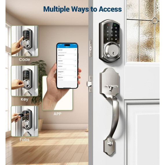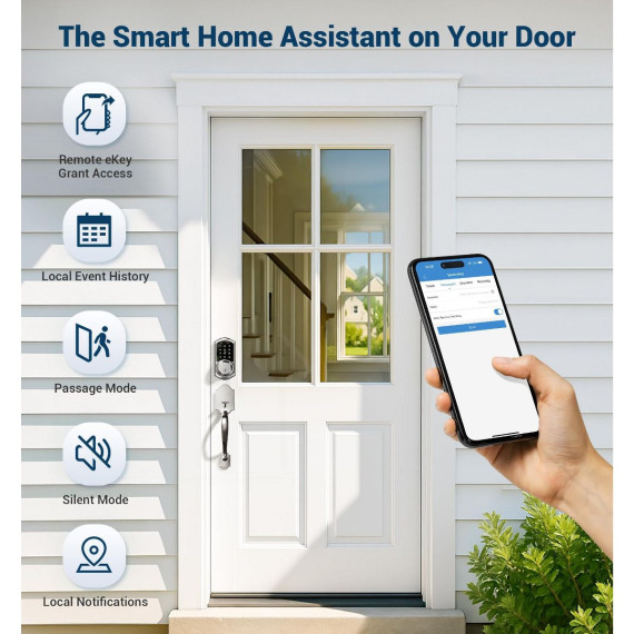 Upgrade your home security with this smart front door lock set. It offers 5 ways to access, including app control, codes, fobs, mechanical keys, and thumb turns. With app control, you can remotely generate eKeys, manage users, and view access records. It supports over 250 user codes for intelligent management, making it suitable for various places like houses, apartments, offices, and hotels. The lock comes with enhanced security features such as auto - lock, one - touch locking, and an anti - peeping and anti - hacking touchscreen keypad. It can be integrated with smart home systems using a separate gateway for voice control and real - time notifications. Installation is a breeze as it fits most US standard doors and has an adjustable design for pre - drilled holes. Simplify your life and enhance your home's safety with this advanced lock.