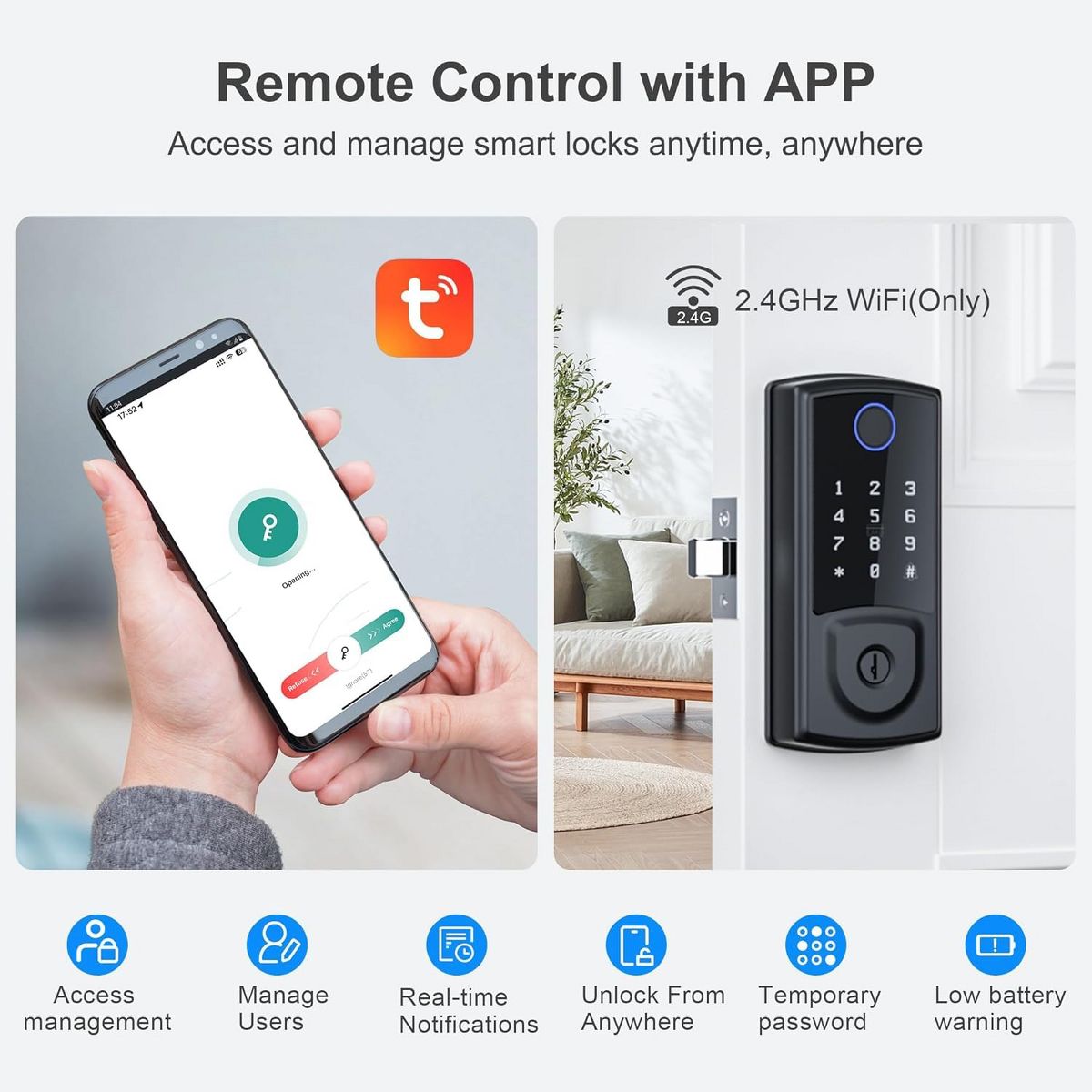 Upgrade your home security with this smart door lock. It's a keyless entry solution for the front door, featuring a touchscreen keypad and app remote control. With a 5 - in - 1 unlocking method, installation is a breeze, taking less than 10 minutes with just a screwdriver. You can unlock the door using an IC card, PIN code, or fingerprint. Homeowners can create temporary access codes for guests. The incorrect - try protection enhances security, and it operates well in temperatures from - 4°F to 131°F. The Tuya APP allows for remote control, including generating and sharing temporary passwords. It also offers easy setup, access management, and real - time notifications. The auto - lock and one - touch lock features provide convenience. Whether it's your home, apartment, office, or hotel, this door lock is a perfect fit, bringing you a new level of security and convenience.