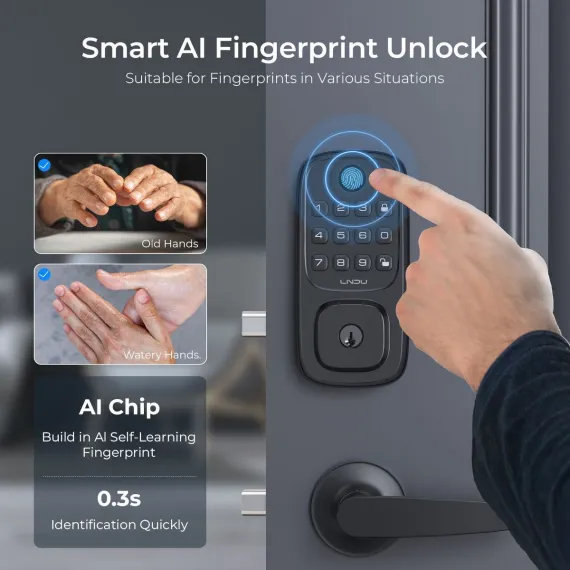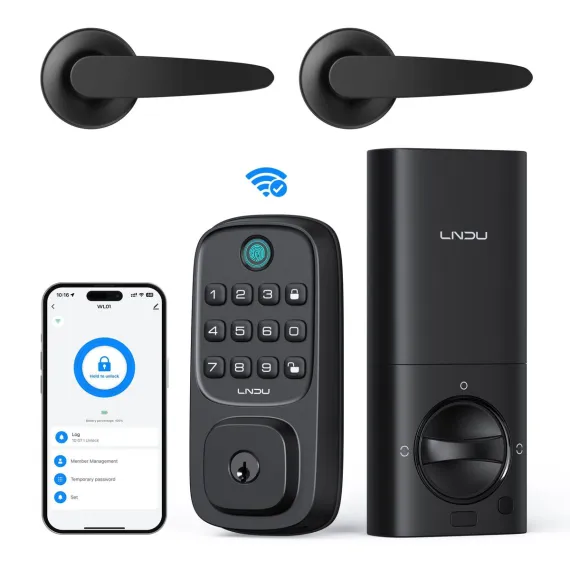 The LNDU WL01 WiFi Smart Lock offers keyless entry via app, fingerprint, PIN, eKey, or mechanical key. Store 50 fingerprints, generate 100+ PINs, and share access securely. Its ANSI Grade 3 door lock ensures robust security with remote Wi-Fi control, instant fingerprint scans (0.3s), or password entry—ideal for homes, rentals, or offices
