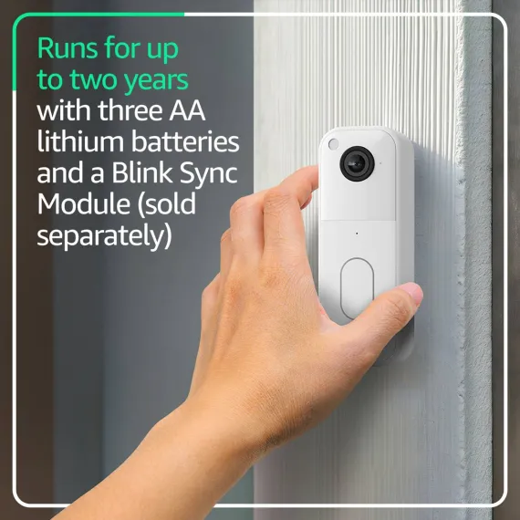 Easily install Blink Video Doorbell wire-free or connect to existing doorbell wiring. Once paired with your Blink Sync Module, enjoy up to two years of powerful battery life, so you can always know who's there. Our second-generation Video Doorbell provides a 150° head-to-toe field of view, allowing you to greet guests and watch packages get delivered in a 1:1 aspect ratio, day and night, with HD infrared night vision. In the box: Includes one Video Doorbell with three AA Energizer lithium batteries and a mounting kit (including screws and anchors). Required Sync Module (sold separately) not included.