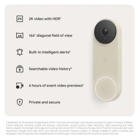 Google Nest Doorbell (Wired, 3rd Gen) - Video Doorbell Camera with 2K Video - Works with Google Home - With Gemini - Linen