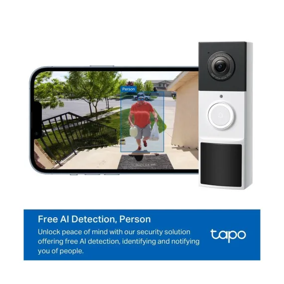 For exceptional front door and yard security, choose TDB21. Witness every detail in 2K resolution and ensure there are no blind spots with the expansive 160° head-to-toe field of view. Enjoy wire-free convenience with long-lasting battery. Choose flexible storage options with a microSD card (sold separately) or cloud storage with a Tapo Care subscription. The free smart AI feature detects people visiting your door, keeping you informed without any hidden fees. Finally, the doorbell offers clear color night vision and a spotlight for substantial security even in the darkest conditions.