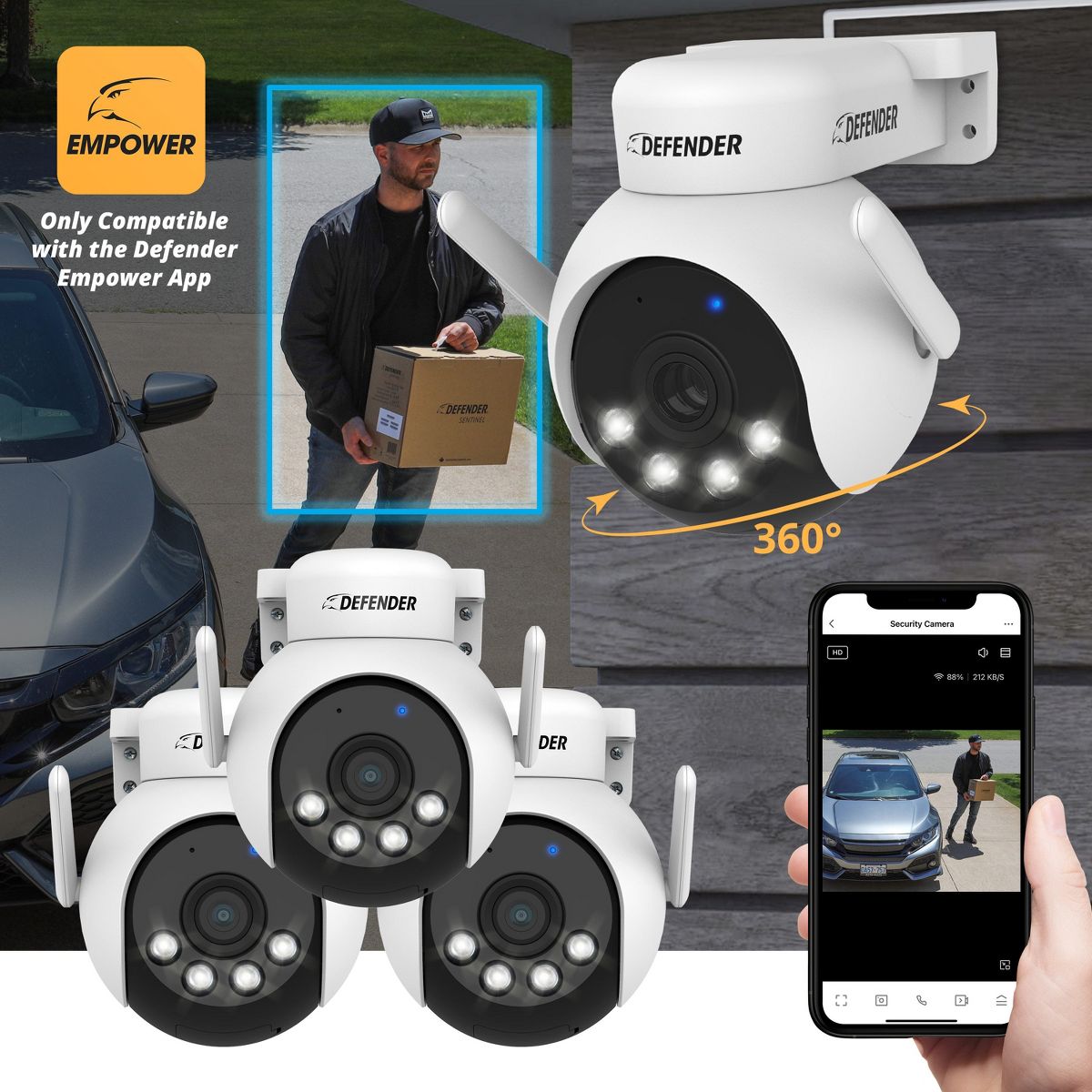 Home security just got smarter. 4K Everwatch PTZ utilizes revolutionary AI Technology to track, monitor and detect movement with an impressive 360◦ of coverage. Equipped with color night vision for 24/7 vibrant recording. Immensely accurate SMART Human Detection can notify you immediately when an intruder is detected and deploy a lightening quick deterrence siren and powerful spotlight. You will never need to worry about your home or businesses security again. Set up in under 5 minutes and unlock the benefits and true freedom of 4K Everwatch PTZ. Only compatible with Defender Empower app. Can not be used with other Defender apps.