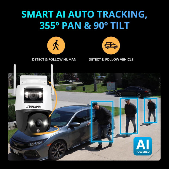 Unveiling the future of home surveillance technology. Incredible, limitless 3K PLUS clarity with dual lens for panoramic viewing. Stay secured with SMART AI-powered automatic human/vehicle tracking, or remotely pan, tilt & zoom your Guard Pro with the top-rated free mobile app. Integrated with active siren & strobe light deterrence so you can be alerted of trespassers immediately. 24/7 security that provides vibrant color footage, even in pitch darkness with color night vision capabilities. ONLY compatible with Defender Guard app. Can not be used with other Defender apps.