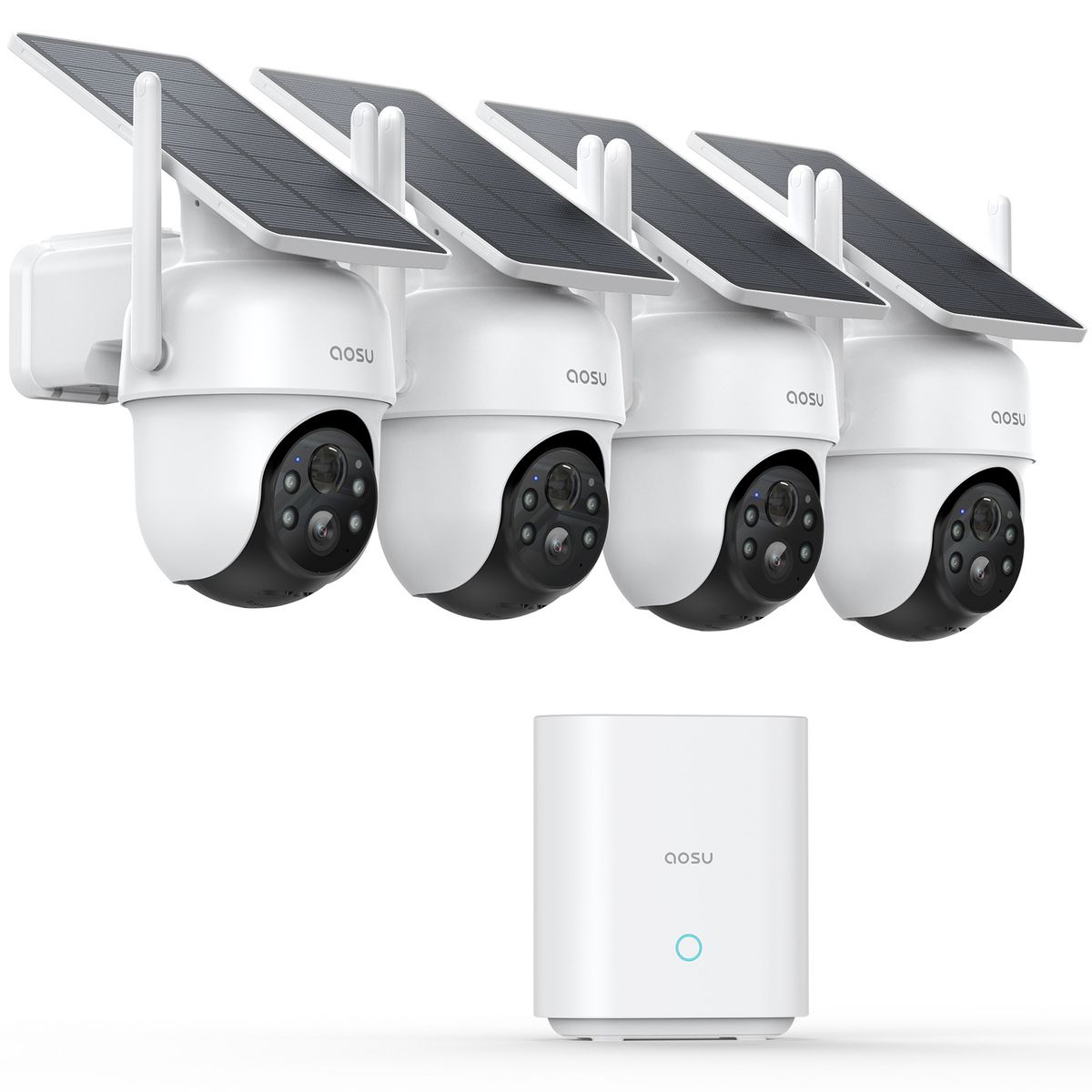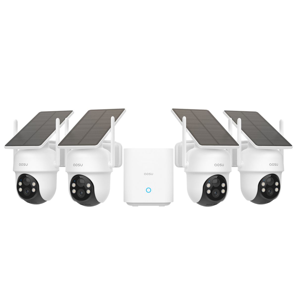 Family safety is aosu’s top priority. We’re devoted to protecting what matters most to you by offering smart security solutions that blend simplicity with cutting-edge technology. Protect your home with the aosu 2K/3.0 MP solar security camera kit with Home Station. Capture every event in clear 2K QHD high-definition and use the panoramic PTZ feature to rotate each camera across a 360° view, eliminating blind spots. Each camera is equipped with 4 LED spotlights to deliver excellent color night vision, doubling the light source compared to standard models. Advanced AI tracking automatically focuses on and tracks movements when a person is detected. Powered by sunlight, the solar cameras operate continuously without need to be charged. Just 3 hours of daily sunlight keeps them running even on cloudy days. Mount them anywhere for 365 days of uninterrupted surveillance. The included Home Station provides instant notifications and stable live streaming over both 2.4-GHz and 5-GHz Wi-Fi®. Cross-camera tracking lets you view live streams from up to 4 areas simultaneously on 1 screen. And all recordings are encrypted and stored locally in the Home Station with its 32 GB of storage - no subscriptions or hidden costs - providing up to 2 months of video loop recording.