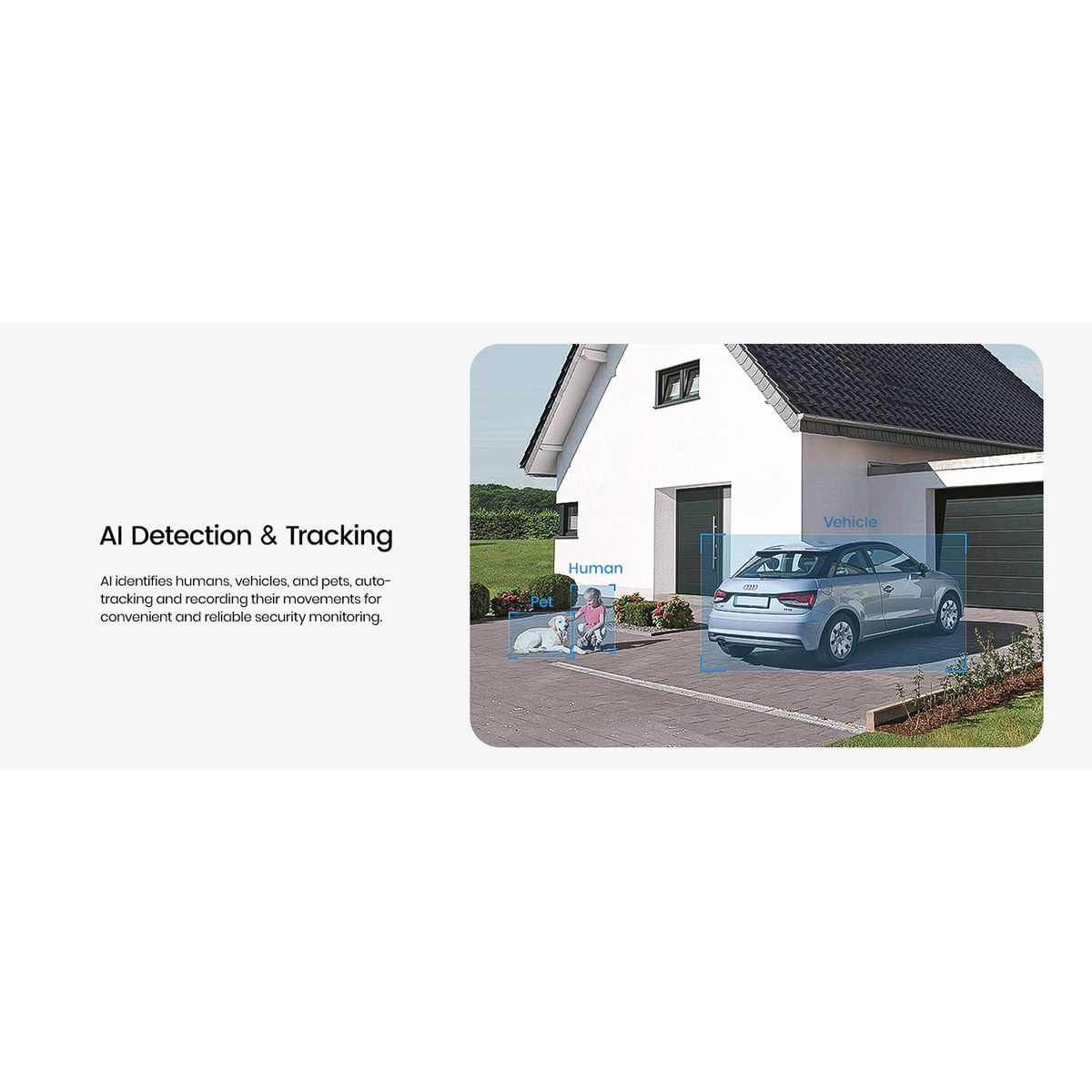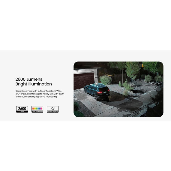 The hardwired Floodlight Cam Pro from aosu is your bright eyes for day and night. The 3K, 5.0-MP Wi-Fi® camera features continuous 24/7 recording so you can experience full-color recording in any weather (IP65 rated), day or night. When detecting intruders in low-light or at night, the system will activate the intense, 2,600-lumen floodlights and sound a 105-dB siren while sending instant notifications via app. 3 PIR sensors detect movement beyond sight, automatically adjusting the lens for reliable tracking in a wide 270° range. Pan 360°, tilt 90°, and digitally zoom 6x via app for comprehensive surveillance coverage. Built-in AI identifies and tracks humans, vehicles, and pets, ensuring no blind spots. 2-way audio lets you chat effortlessly with visitors via app. It can also transform a female user’s voice into a male one for added privacy. The 2.4-GHz Wi-Fi® camera supports up to a 128-GB microSD™ Card (not included) for on-board recording or you can set up an optional Cloud storage subscription plan. _