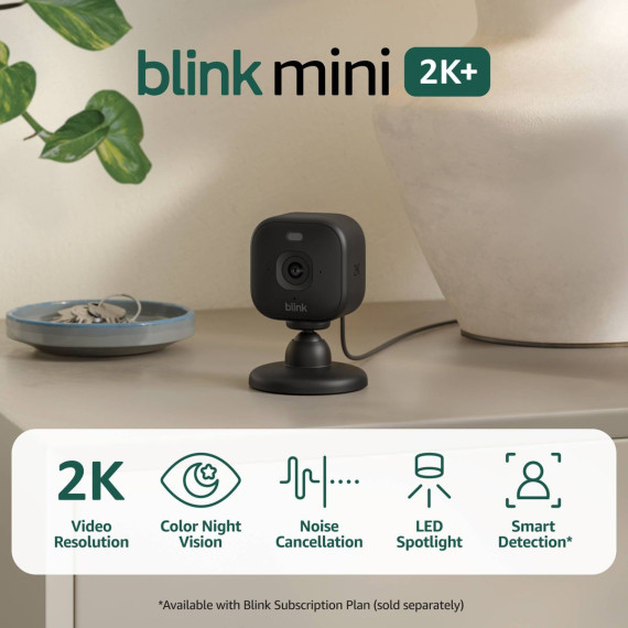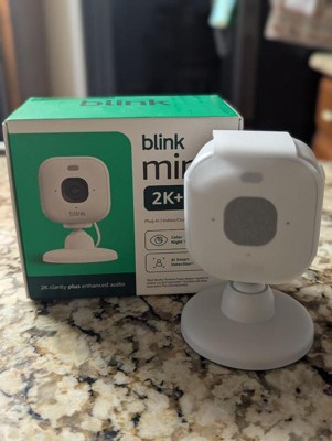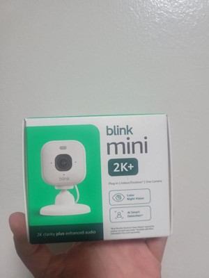 Mini 2K+ is our most powerful, compact plug-in security camera yet, delivering stunning 2K video resolution, a 138° field of view, and 4x zoom for detailed footage day or night. With AI smart detection (Blink Subscription Plan required), it can identify people or vehicles and help deter unwanted activity using a built-in security siren. Plus, you’ll get crisp two-way audio, color night vision with the spotlight, and seamless control from the Blink app. Includes one Blink Mini 2K+ camera, mounting kit including stand, USB cable, and power adapter.