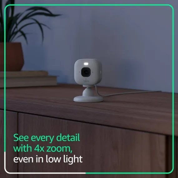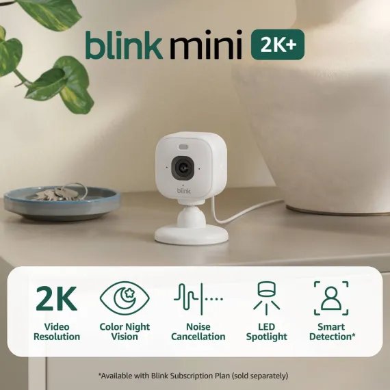 Mini 2K+ is our most powerful, compact plug-in security camera yet, delivering stunning 2K video resolution, a 138° field of view, and 4x zoom for detailed footage day or night. With AI smart detection (Blink Subscription Plan required), it can identify people or vehicles and help deter unwanted activity using a built-in security siren. Plus, you’ll get crisp two-way audio, color night vision with the spotlight, and seamless control from the Blink app. Includes two Blink Mini 2K+ camera, mounting kit including stand, USB cable, and power adapter.