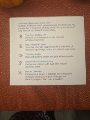 Help protect what matters most with Blink’s fourth generation of wire-free Outdoor smart security cameras. Outdoor 4 is innovative yet easy to use with up to two years of powerful battery life. Affordable peace of mind starts here. Stay close to home from anywhere. See what’s happening with HD live view and infrared night vision. Speak to people and pets with crisp two-way audio – it’s like being home even when you’re not. Control all your Blink devices in the Blink app with ease. In the box: 1 Blink Outdoor 4 camera, 2 AA lithium metal batteries, 1 Mounting kit, 1 Sync Module 2, 1 USB Cable, 1 Power Adapter