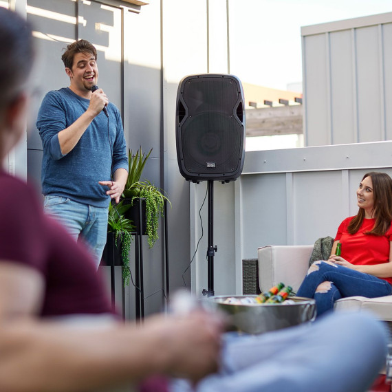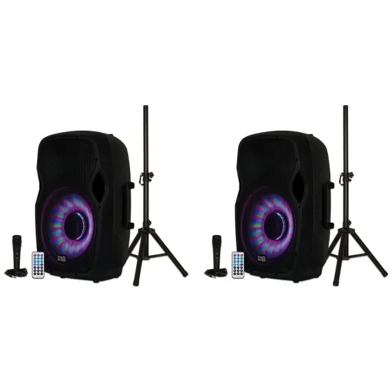 Packed with features, each entertainment system has a multi-colored LED woofer, an integrated power amplifier on a 1000-watt system, 4 input options, a built-in FM tuner, and a graphic equalizer, along with options to play music from a USB drive or SD card. 4 inputs mean lots of options for karaoke or jamming with friends, whether using the 0.25-inch mic, 0.25-inch instrument, 3.5-millimeter AUX, or the RCA to hook up to another speaker. Included with each Bluetooth speaker are a mic with cable, speaker stand, and remote control, which comes in handy to manage volume from across the room.