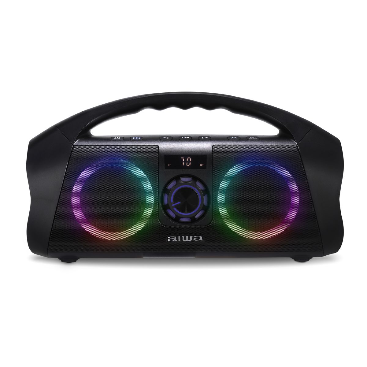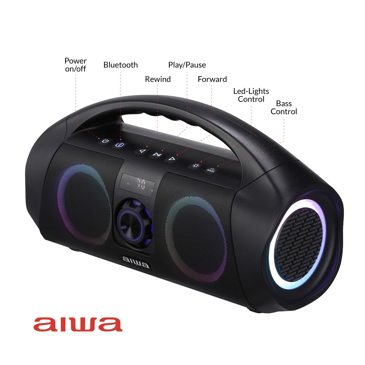 Enjoy Clear, Crisp & Loud Music Anywhere You Go With AIWA Bluetooth Wireless Boombox Speaker! AIWA Bluetooth boombox speaker with LED lights offers just the right highs and lows even at loud volumes. They pair up wirelessly with your Bluetooth devices or through an Aux cable to play your favorite songs. When it comes to quality, we make no exceptions. Our portable waterproof Bluetooth speaker uses a compact design with sturdy materials to make sure it can handle day to day use at home and on the go.