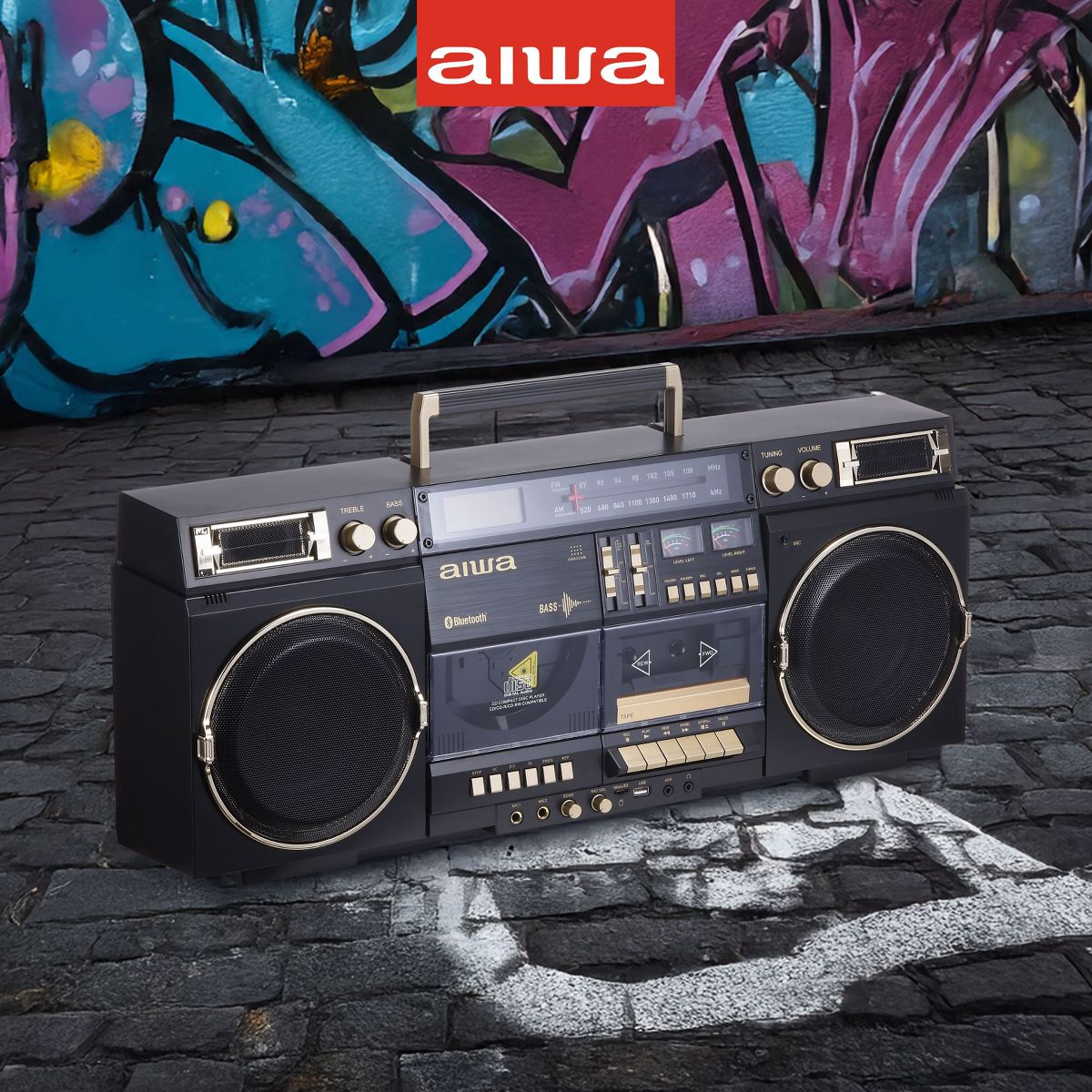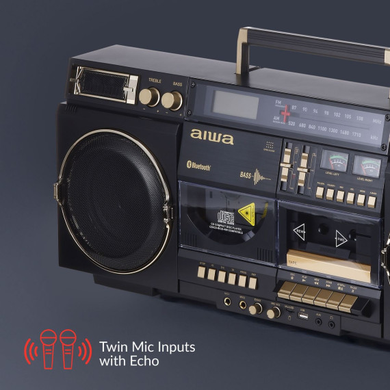 aiwa Retro Boombox CD Player with Cassette Recording, Bluetooth 5.0, VU Meters, LCD Display, Dual 40W Speakers