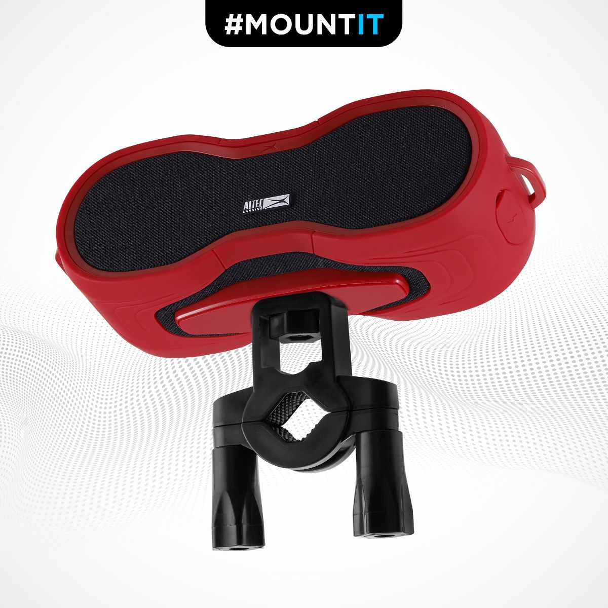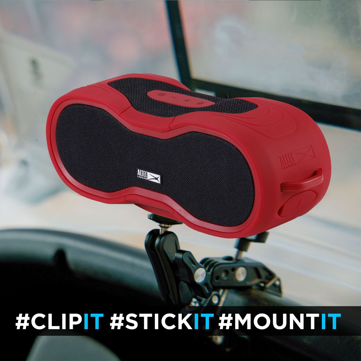 includes a carabiner clip for easy transport, along with a built-in speaker mount for