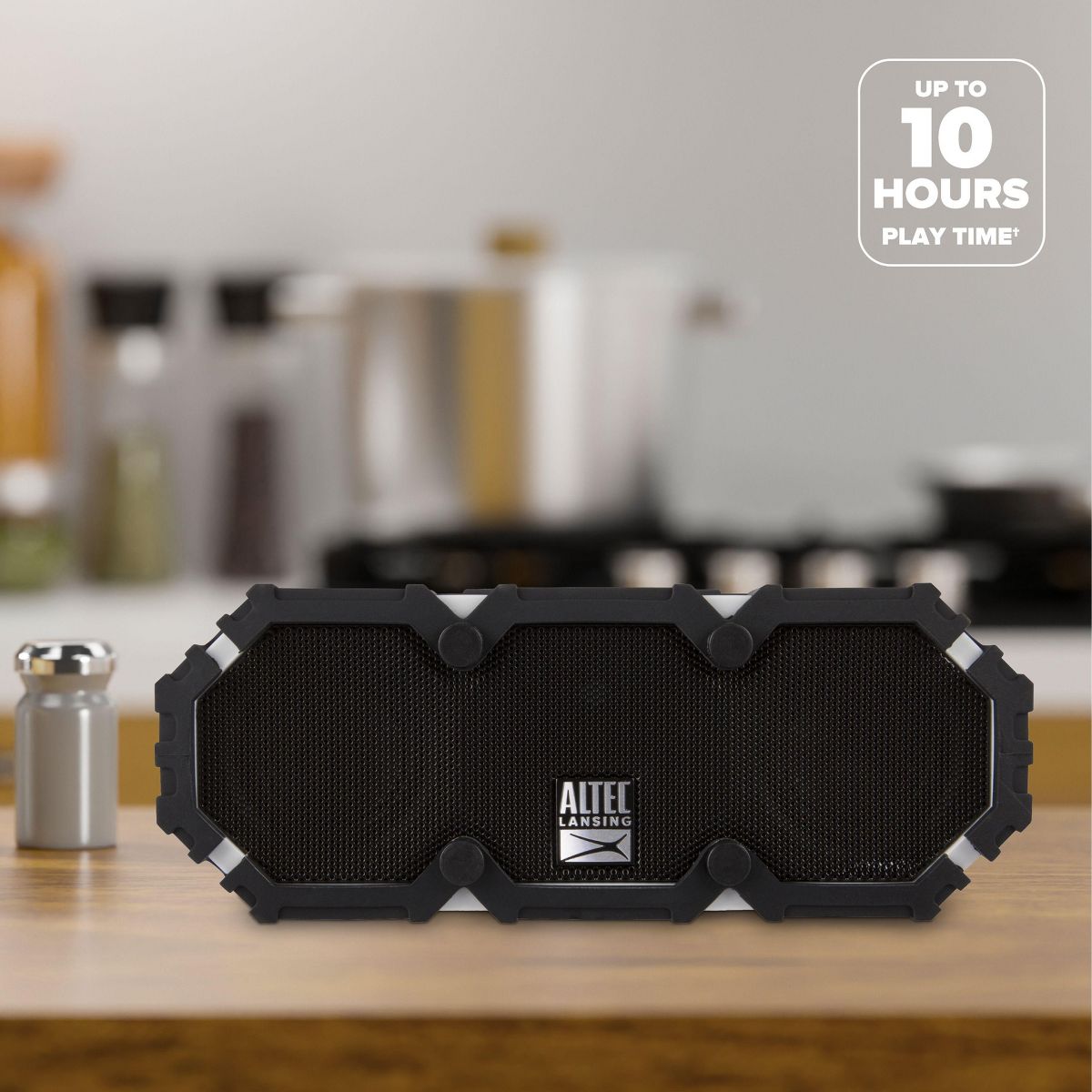 The Altec Lansing Mini Life Jacket Bluetooth Wireless Speaker features a rugged compact design, voice confirmation and an onboard microphone for clear, hands-free communication. The rugged Mini Life Jacket is IP67 Waterproof/Dustproof/Shockproof rated and it floats! With 10 hours of battery life, Aux In and an integrated carabineer the Mini H2O will take the music wherever you want to go. Water submersible and sand, snow and shockproof. IP67 certified. Built-in rechargeable battery with 10 hours of life. Hear and be heard with speakerphone functionality. Easy pairing to any Bluetooth-enabled device with vocal confirmation and 30 foot range. Universal mount accessory included for all life's adventures.