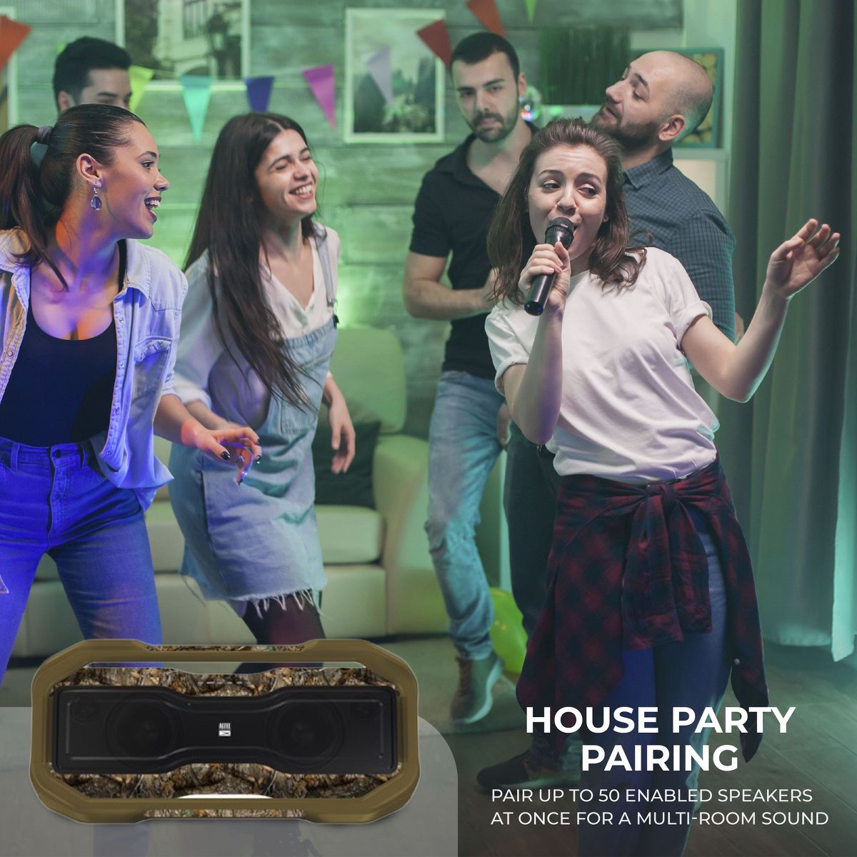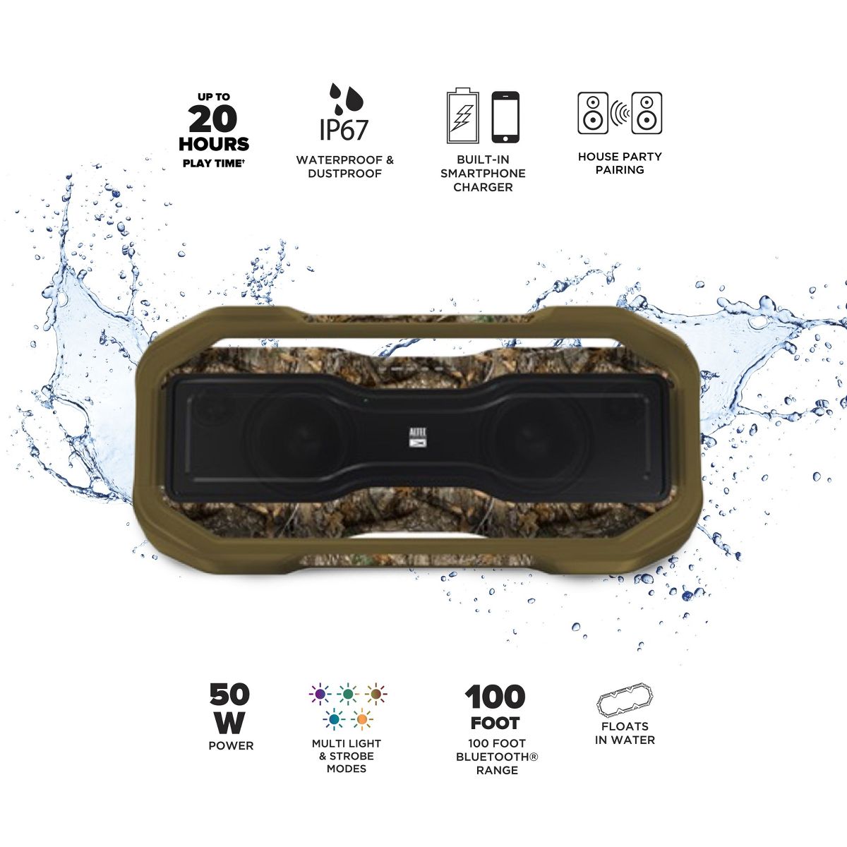 Get the party started with the Altec Lansing RockBox XL. This powerful speaker will blow you away with its crystal clear and bass pumping sound! This certified party speaker is guaranteed to get anyone off their feet and up on the dance floor. With 5 different LED illuminated modes, this speaker will keep the party going throughout the night. House Party Pairing will allow you to connect multiple house party enabled speakers to keep the music playing throughout every room of the house. This powerhouse speaker is certified IP67 Waterproof rating and can even float upright in the water to keep the music playing no matter where the party takes you.