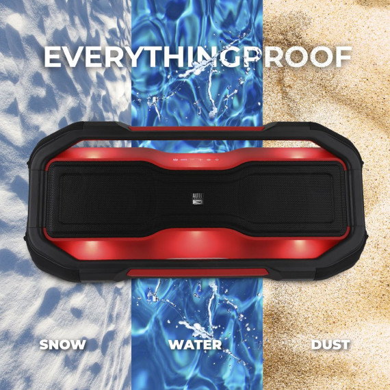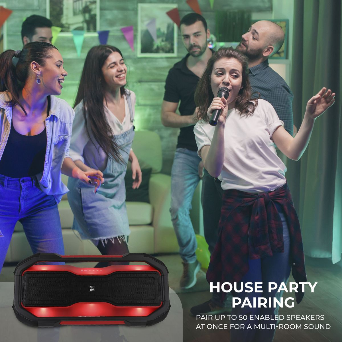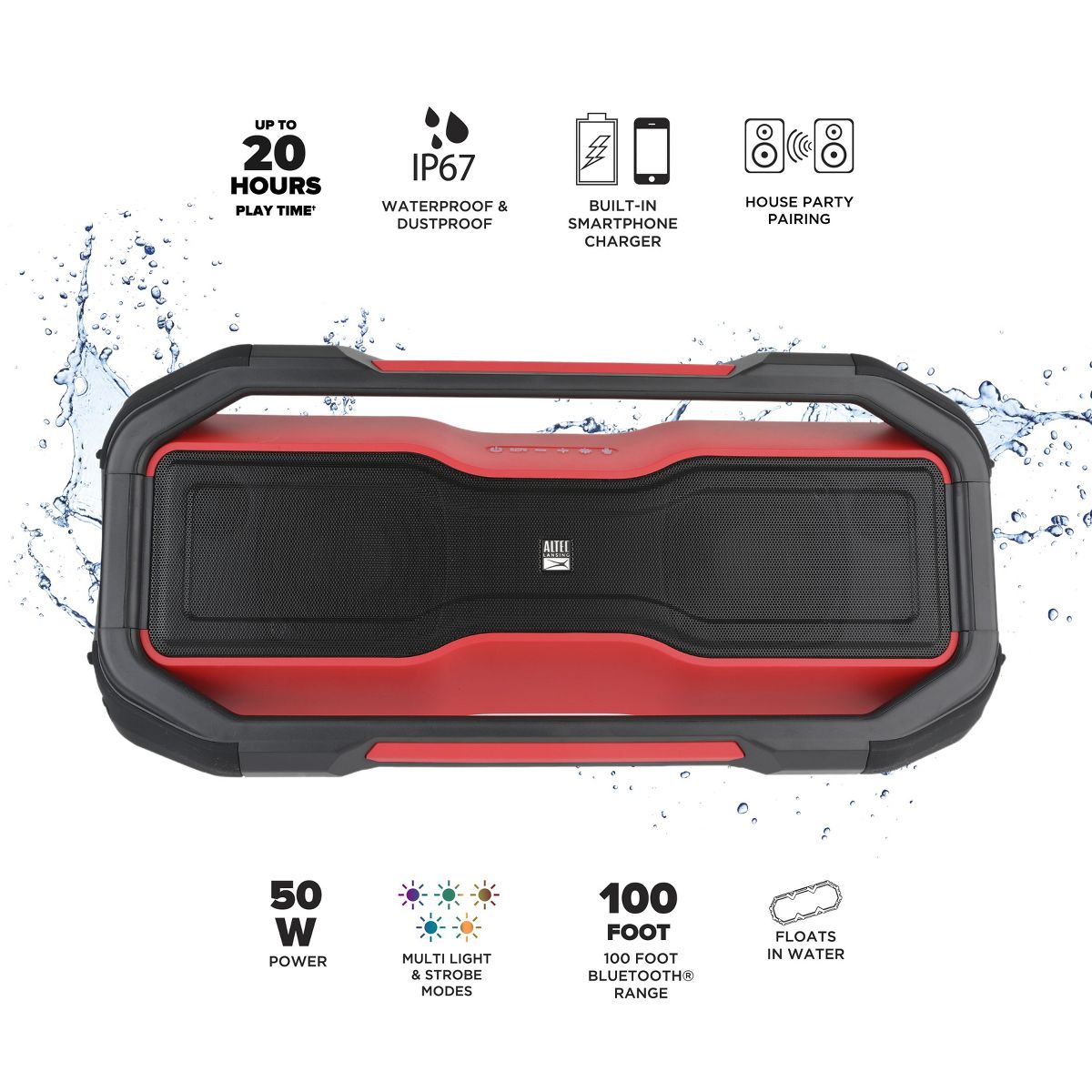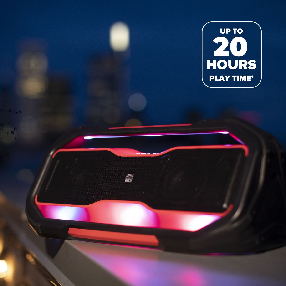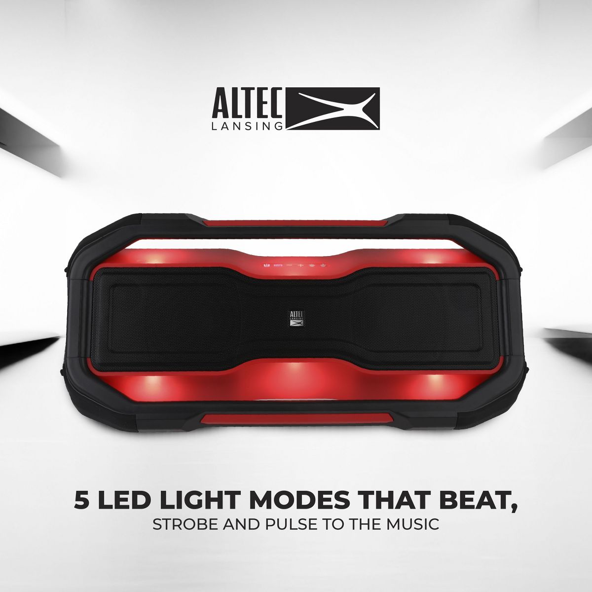 Get the party started with the Altec Lansing RockBox XL. This powerful speaker will blow you away with its crystal clear and bass pumping sound! This certified party speaker is guaranteed to get anyone off their feet and up on the dance floor. With 5 different LED illuminated modes, this speaker will keep the party going throughout the night. House Party Pairing will allow you to connect multiple house party enabled speakers to keep the music playing throughout every room of the house. This powerhouse speaker is certified IP67 Waterproof rating and can even float upright in the water to keep the music playing no matter where the party takes you.