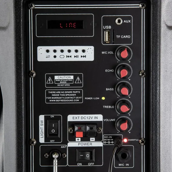 The beFree Sound 12 Inch 2500 Watts Bluetooth Portable Party Speaker with illuminating lights brings more power and sound to house parties and other events. Dazzle the stage with an array of illuminating light patterns built into the speaker. Bring along to camping trips or backyard barbeques, with the portable handle bars and wheels this party speaker can go anywhere. Great for an at home or dive bar karaoke night; this sound set comes with a microphone as well function karaoke controls. Never let the party simmer down, the 12v rechargeable battery can last till the night ends!