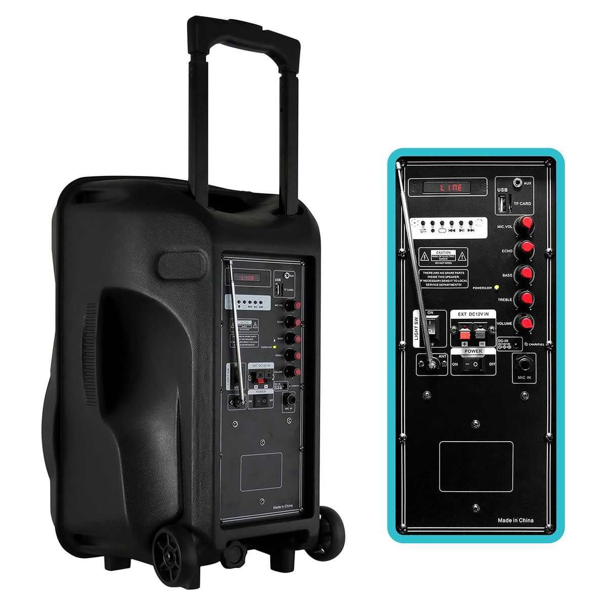 The beFree Sound 12 Inch Bluetooth Rechargeable Portable Party PA Speaker with Illuminating Lights brings more power and sound to house parties and other events. Dazzle the stage with an array of illuminating light patterns built into the speaker. Bring along to camping trips or backyard barbeques, with the portable handle bars and wheels this party speaker can go anywhere. Great for an at home or dive bar karaoke night; this sound set comes with a microphone as well function karaoke controls. Never let the party simmer down, the rechargeable battery can last till the night ends!